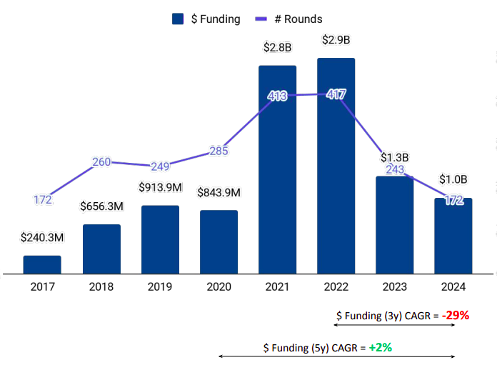 ● FinTech: Funding decreased by 19.2% compared to 2023 and 52.0% compared to 2022.