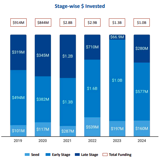 ● Early-Stage Funding: Early-stage funding experienced a steep 44.83% decline, totaling $0.58 billion in 2024, down from $1.04 billion in 2023.