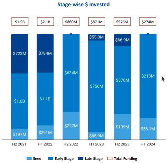 Seed-stage funding saw a total funding of $56.1 million in H1 2024, a decline of 14.9% from $65.9 million raised in the first half of 2023. Early-stage funding stood at $218 million in H1 2024, a plummet of 70.9% from the $750 million raised in H1 2023.