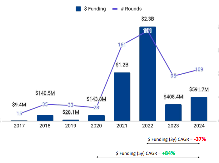 The year also saw increased activity in terms of exits, with seven acquisitions recorded, a significant increase from the four acquisitions in 2023. Notable deals included Propine being acquired by Komainu and SolanaFM by Jupiter. Tridentity became the only company in this space to go public in 2024, after an absence of IPOs the previous year.
