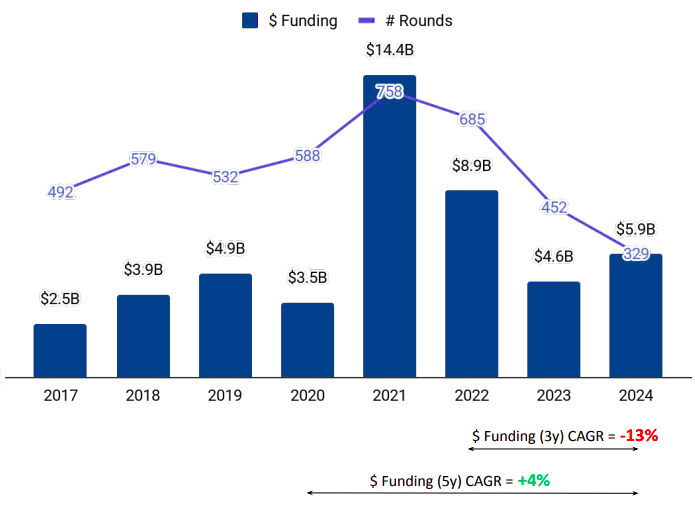 In 2024, Canadian tech startups raised $5.9 billion in funding, representing a 29% increase from the $4.6 billion secured in 2023 and a drop of 33.48% compared to the $8.9 billion raised in 2022.