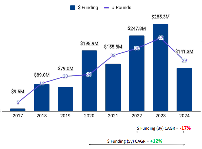 Total funding in 2024 amounted to $141 million, reflecting a 50% drop from the all-time high of $285 million in 2023 and a 43% decline compared with $248 million in 2022. Investors have become cautious due to global macroeconomic uncertainties, including elevated borrowing costs and a slowdown in demand.