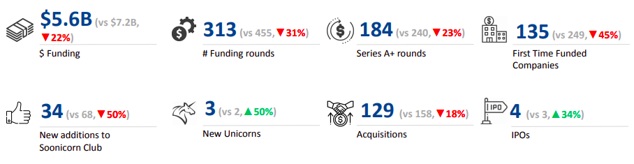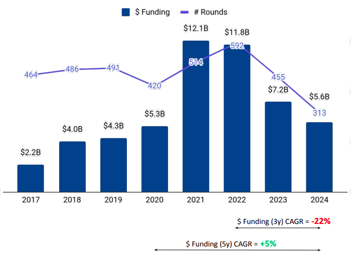 ● FinTech: Funding rose by 24% compared to 2023 but declined significantly by 67% compared to 2022.