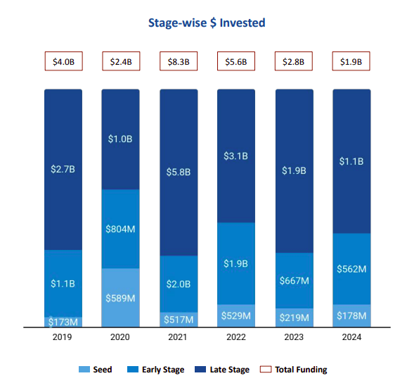 The downturn was evident across all funding stages, with late-stage rounds being the most affected. Late-stage funding amounted to $1.1 billion, marking a 42% reduction compared to the $1.9 billion raised in 2023 and a sharp 65% decline from $3.1 billion in 2022. Early-stage rounds followed a similar trend, recording $562 million in funding in 2024. This figure reflects a 16% drop from the $667 million raised in 2023 and a substantial 70% decline from $1.9 billion in 2022. Seed-stage funding also faced challenges, reaching $178 million in 2024—down 19% from $219 million in 2023 and 66% from $529 million in 2022.