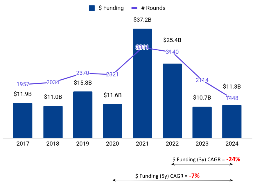 SportsGig Economy, Retail, and Enterprise Applications stood out as top-performing sectors. The Gig Economy recorded $2.2 billion in funding, an extraordinary 414% increase from $420 million in 2023, highlighting its rapid growth and investor confidence. Retail, on the other hand, secured $2.6 billion, reflecting a 13% decline from $3 billion in 2023, indicating market recalibration. Enterprise Applications saw $2.2 billion in funding, an 11% dip from $2.5 billion in 2023, reflecting strategic investment shifts.