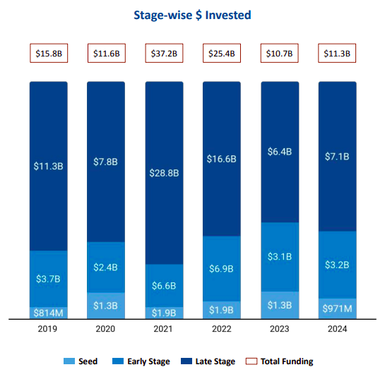 2024 also saw strong backing from top investors, with Accel, Blume Ventures and Peak XV Partners being the top VCs in the India Tech ecosystem. In the seed stage, Venture Catalysts, Z Nation Lab and Blume Ventures led the way as the top investors, while Accel, Peak XV Partners and Elevation Capital dominated the early stage and SoftBank Vision Fund, Creaegis and Avataar Ventures emerged as the most active in the late stage.