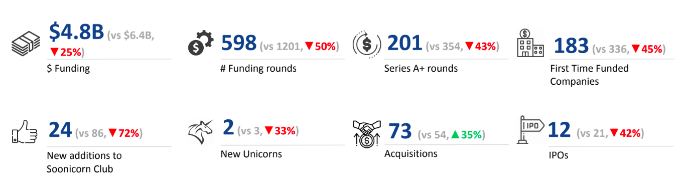 There were 12 startups that went public in H1 2025, as compared to 21 in H1 2024. Some of the notable ones included Ather Energy, Tankup, SS Innovations International and Infonative Solutions going public. Two unicorns emerged in H1 2025, a 33% decline from 3 unicorns in H1 2024.