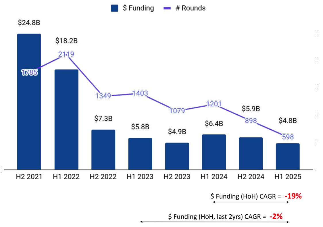 According to the report, Indian tech startups raised $4.8B in H1 2025, a 25% decline from $6.4B in H1 2024 and a 19% drop from $5.9B in H2 2024. Despite the slowdown, India ranked third globally in tech startup funding, ahead of Germany and Israel and trailing the United States and the United Kingdom.