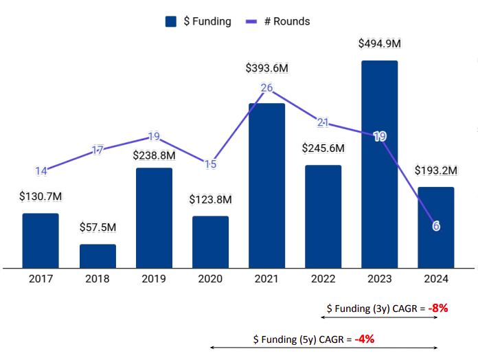 Seed-stage funding fell 16% to $7.7 million in 2024 from $9.2 million in 2023, while early-stage investments plummeted over 80% to $38.5 million in 2024 from $353 million in 2023. Late-stage funding witnessed an 11% uptick to $147 million in 2024, compared with $133 million in 2023.