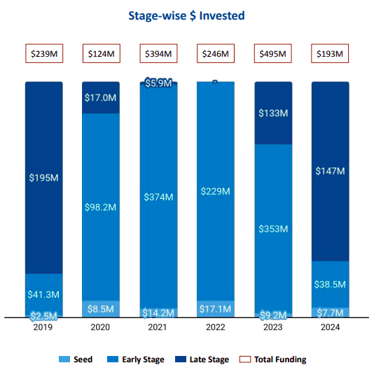 Q4 2024 saw the maximum investment activity across all quarters, with $105 million raised, accounting for nearly half of the total funding for the year. Further, the second half (H2) of 2024 emerged as the most active funding period, raising $111 million—a 35% increase from H1 2024 ($82 million) but a 50% decline from H2 2023 ($231 million).