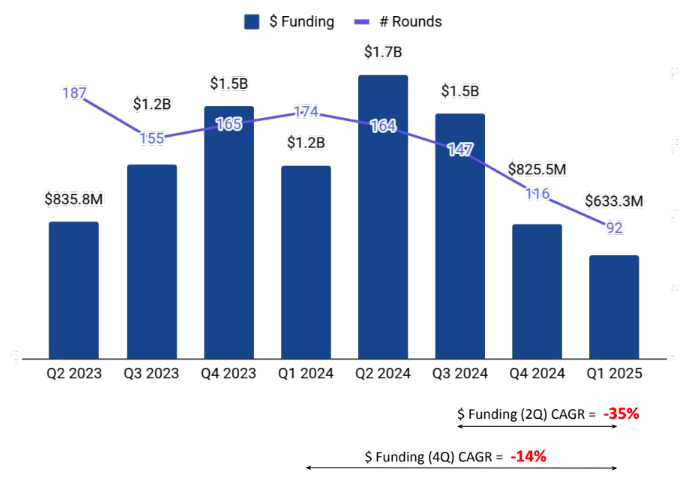 Seed Stage saw a total funding of $57.3M in Q1 2025, a drop of 14% compared to $66.6M raised in Q4 2024, and a drop of 55% compared to $128M raised in Q1 2024. Early Stage saw a total funding of $294M in Q1 2025, an increase of 34% compared to $220M raised in Q4 2024, and a drop of 14% compared to $344M raised in Q1 2024. Late Stage witnessed a total funding of $282M in Q1 2025, a drop of 48% compared to $539M raised in Q4 2024, and a drop of 60% compared to $707M raised in Q1 2024.