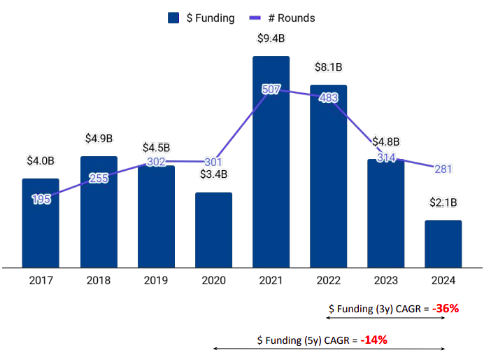 ● Enterprise Applications: Funding decreased by 29% in 2024 compared to 2023 and 77% drop compared to 2022.