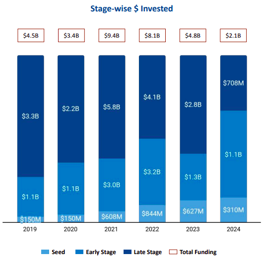● Early-Stage Funding: Early-stage investments dropped by 15.38%, falling to $1.1 billion in 2024 from $1.3 billion in 2023.