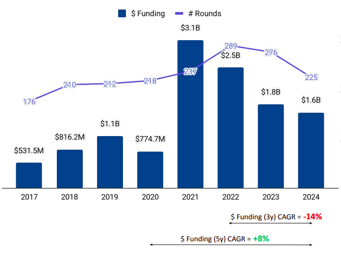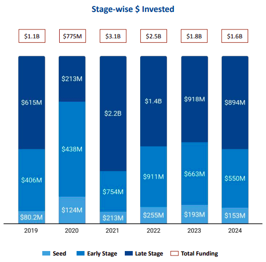 Seed-stage investments saw a total of $153 million, marking a decline of 20.73% compared to 2023 and 40% lower than 2022. Early-stage funding amounted to $550 million, reflecting a 17.04% year-over-year drop and a 39.63% decrease compared to 2022. Late Stage witnessed a total funding of $894M in 2024, a drop of 2.61% compared to $918M raised in 2023, and a drop of 36.14% compared to $1.4B raised in 2022.