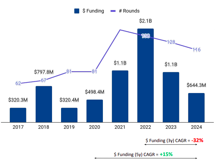 Late-Stage Funding: Late-stage investments dropped to $104 million in 2024, marking a 78.93% decrease from $495 million in 2023.