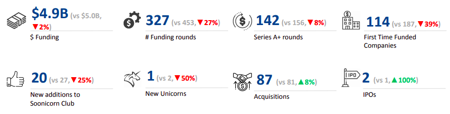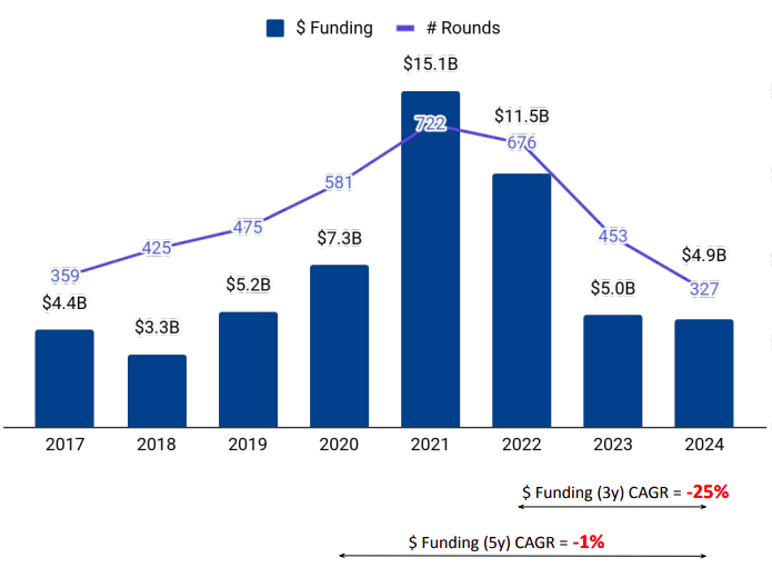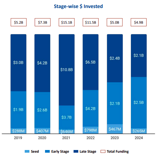 Total funding for the year amounted to $4.9 billion, representing a minor 2% drop from $5 billion in 2023 and a 57% decline from $11.5 billion in 2022. Late-stage funding fell 13% to $2.1 billion in 2024 from $2.4 billion in the previous year (2023). Early-stage funding rose 19% year-over-year to $2.5 billion in 2024 from $2.1 billion in 2023. Seed-stage funding, however, plummeted 43% to $265 million from $467 million in 2023.