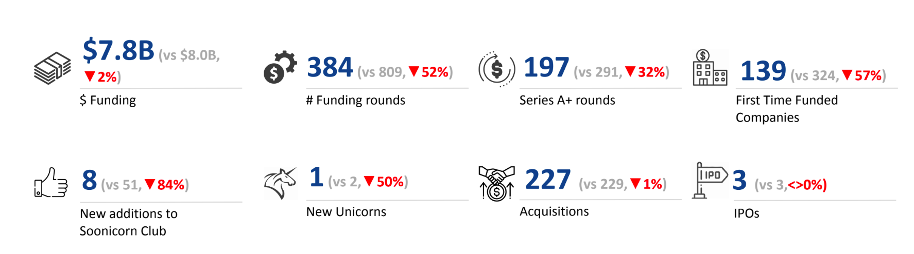 H1 2025 witnessed 14 funding rounds exceeding $100M, compared to 13 such rounds in both H2 2024 and H1 2024. Notable companies securing $100M+ in funding included DAZN, Isomorphic Labs, Rapyd, FNZ, and Dojo. DAZN raised $1.0B in a Series D round, Isomorphic Labs raised $600M in a Series D round, and Rapyd secured $500M in a Series F round. A significant portion of these large rounds originated from Enterprise Applications, Media & Entertainment, and FinTech. Only one unicorn emerged in H1 2025, marking a 50% drop from the two unicorns recorded in H1 2024 and matching the single unicorn seen in H2 2024. Quantum Base, RedCloud, and Vinanz were among the companies that went public during this period.