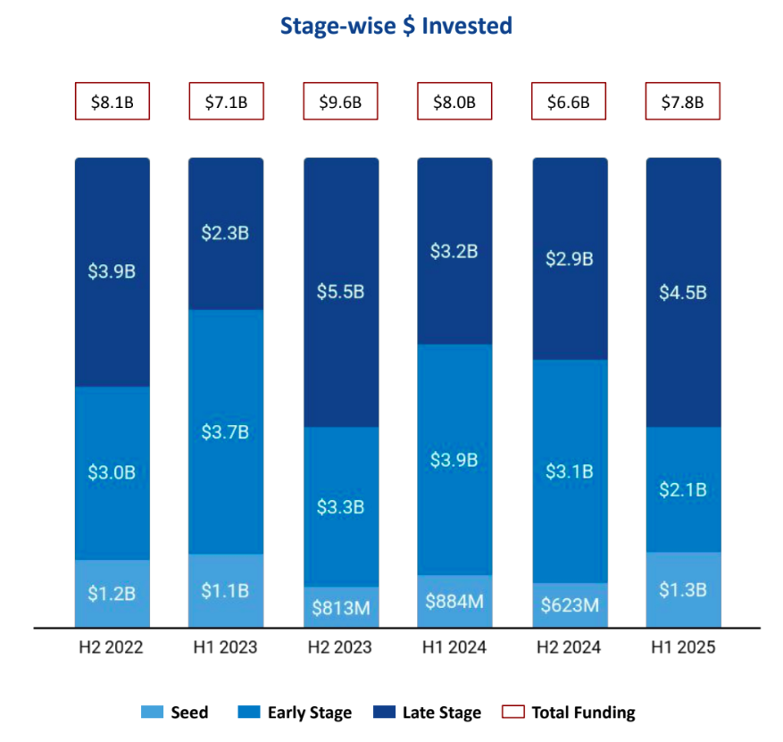 Seed Stage funding reached $1.3B in H1 2025, a 103% increase from the $623M raised in H2 2024 and a 47% increase from the $884M raised in H1 2024. Early Stage funding totaled $2.1B, representing a 32% decline from $3.1B in H2 2024 and a 47% drop from $3.9B in H1 2024. Late Stage funding came in at $4.5B, rising 55% from $2.9B in H2 2024 and 41% from $3.2B in H1 2024.