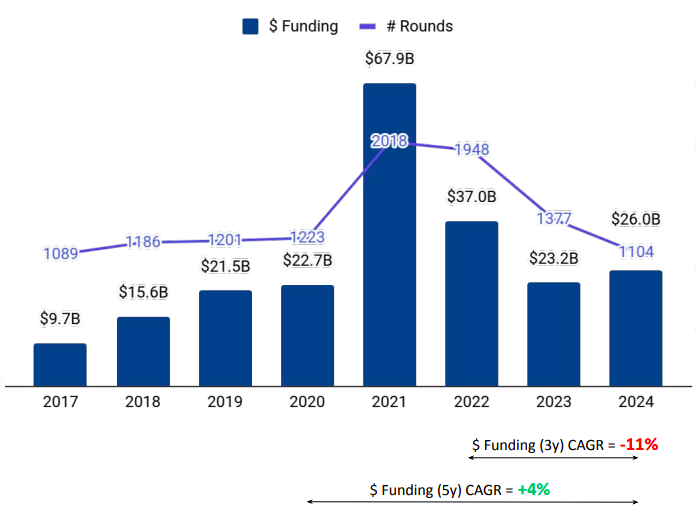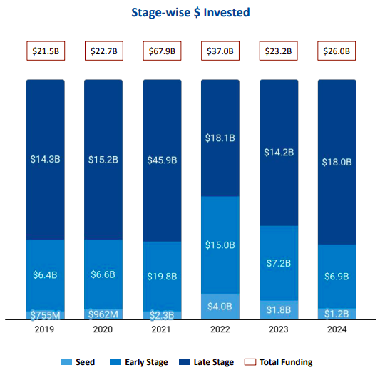 The sector attracted late-stage funding worth $18 billion in 2024, reflecting a 27% increase from the previous year (2023) and consistent with the $18.1 billion raised in 2022. Early-stage funding was $6.9 billion, a 4% drop from $7.2 billion in 2023 and a 54% decline from $15 billion in 2022. Seed-stage funding ($1.2 billion) was the most affected, marking a 33% decrease from $1.8 billion in 2023 and a 70% decrease from $4 billion in 2022.