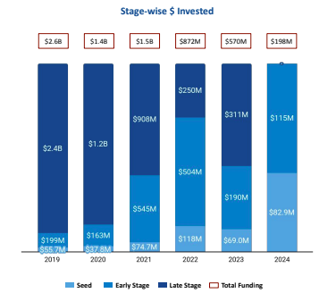Early-stage funding in 2024 amounted to $115 million, representing a 39% decline from $190 million in 2023 and a 77% plunge from $504 million in 2022. Seed-stage funding in 2024 increased to $82.9 million, a 20% rise from $69 million in 2023, but a 30% fall from $118 million in 2022. No late-stage funding was recorded in 2024 compared to $311 million in 2023, and $250 million in 2022.