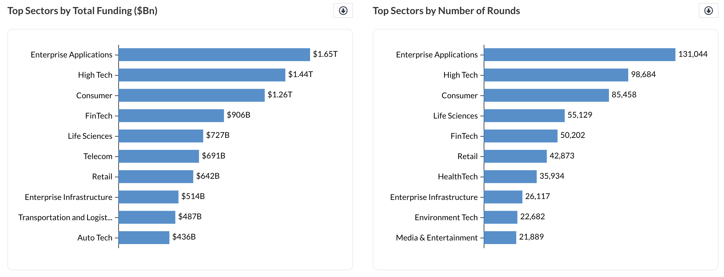 If you’re preparing a market analysis report, the Top Sectors by Funding view can help pinpoint which sectors are driving innovation and attracting the most investor attention.