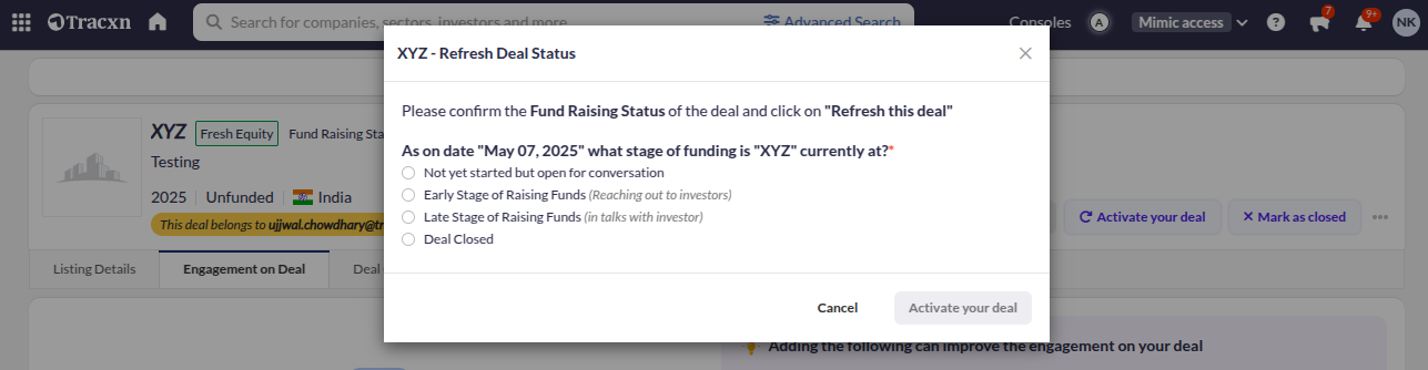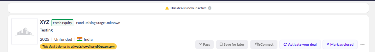 Your deal will become inactive on the platform if it doesn’t have any activity in the last 60 days. To activate your inactive deal, you can click on “Activate your deal” -> update the fundraising stage -> Activate your deal. N8