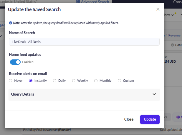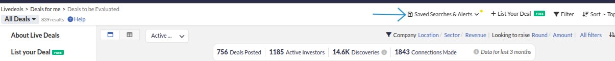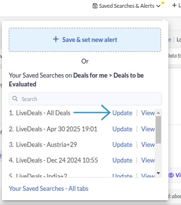 To change your saved search or how often you receive alerts, navigate to Livedeals > Deals for me > Deals to be Evaluated > Saved Searches & Alerts.