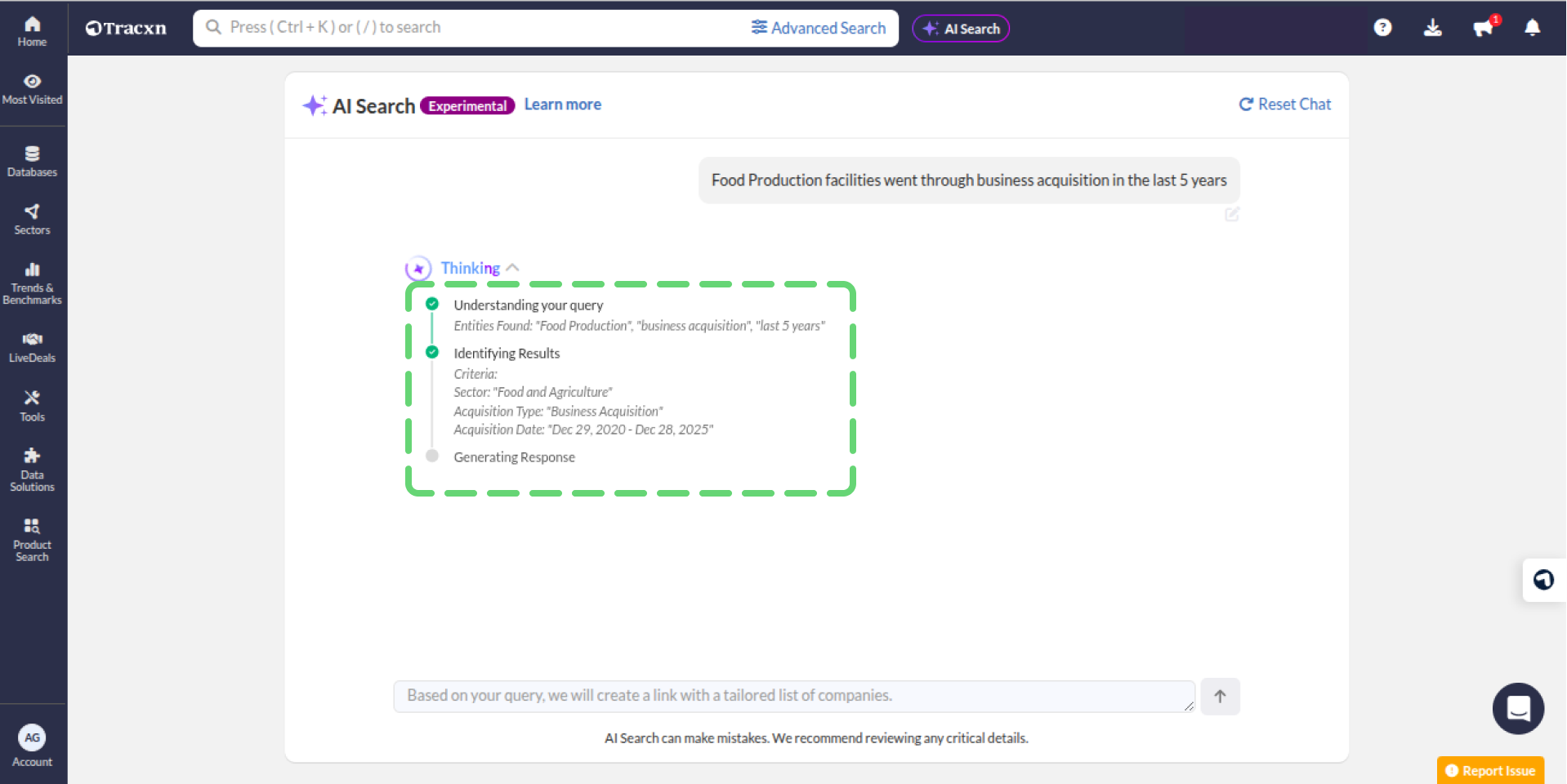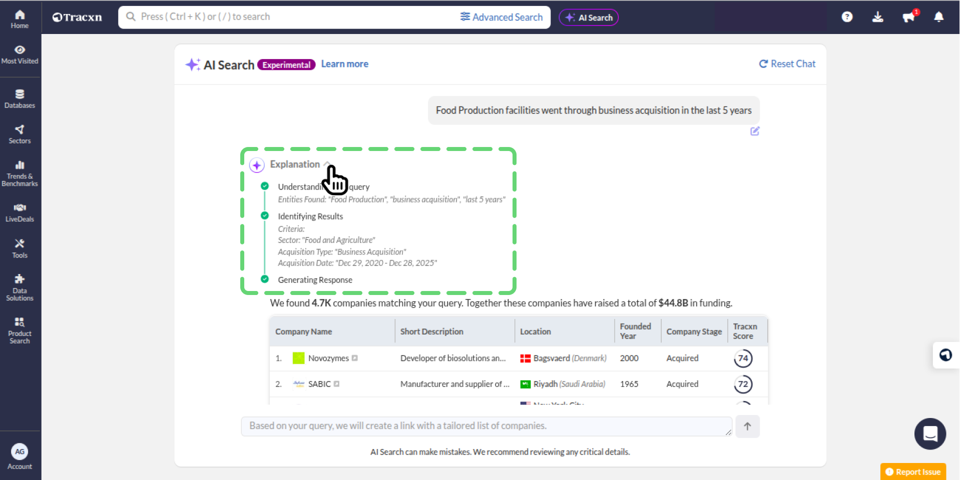 By revealing every step performed in real time and sharing detailed information about the values identified from the user’s query and the corresponding filters applied, our system ensures full traceability, making it a truly explainable AI solution.