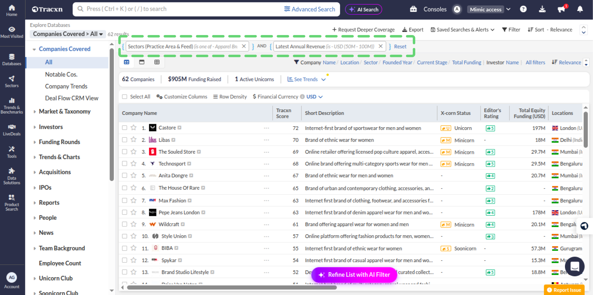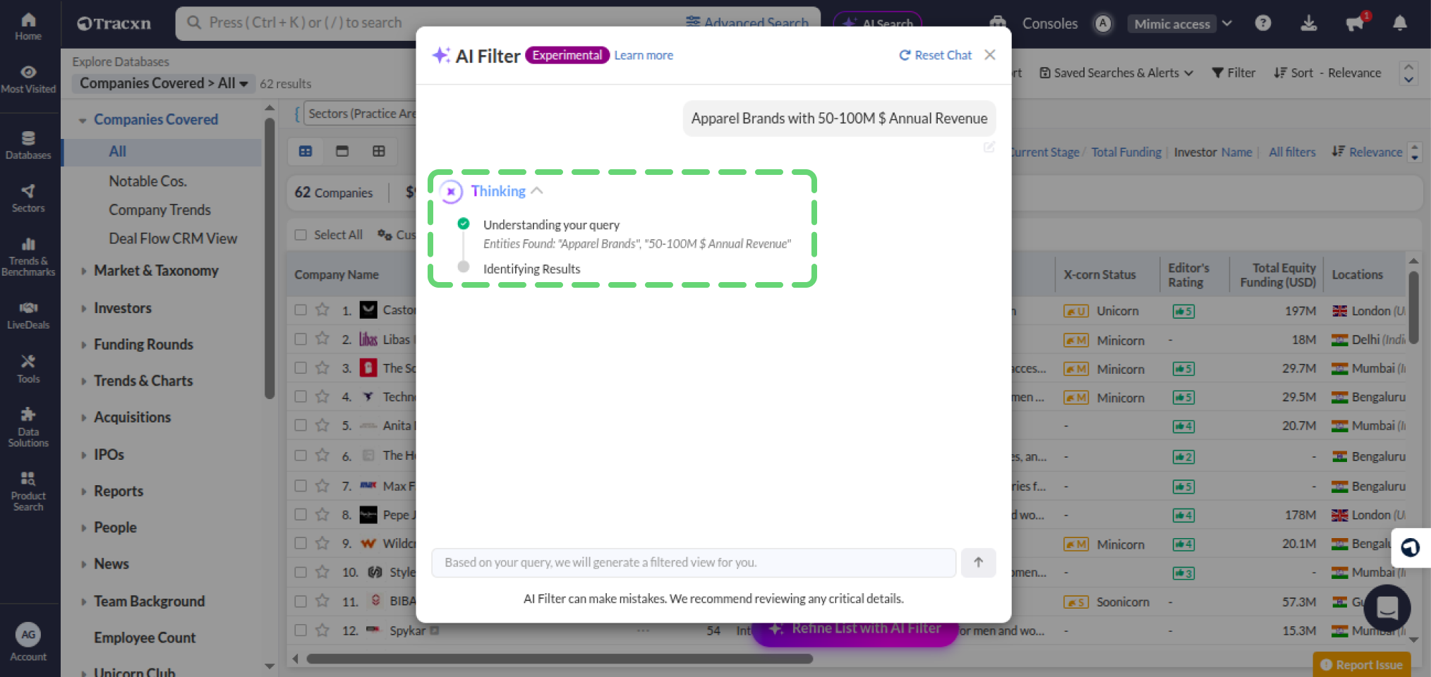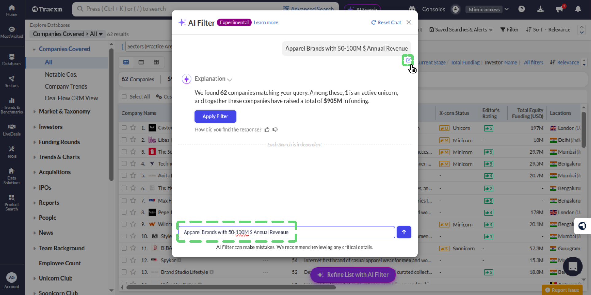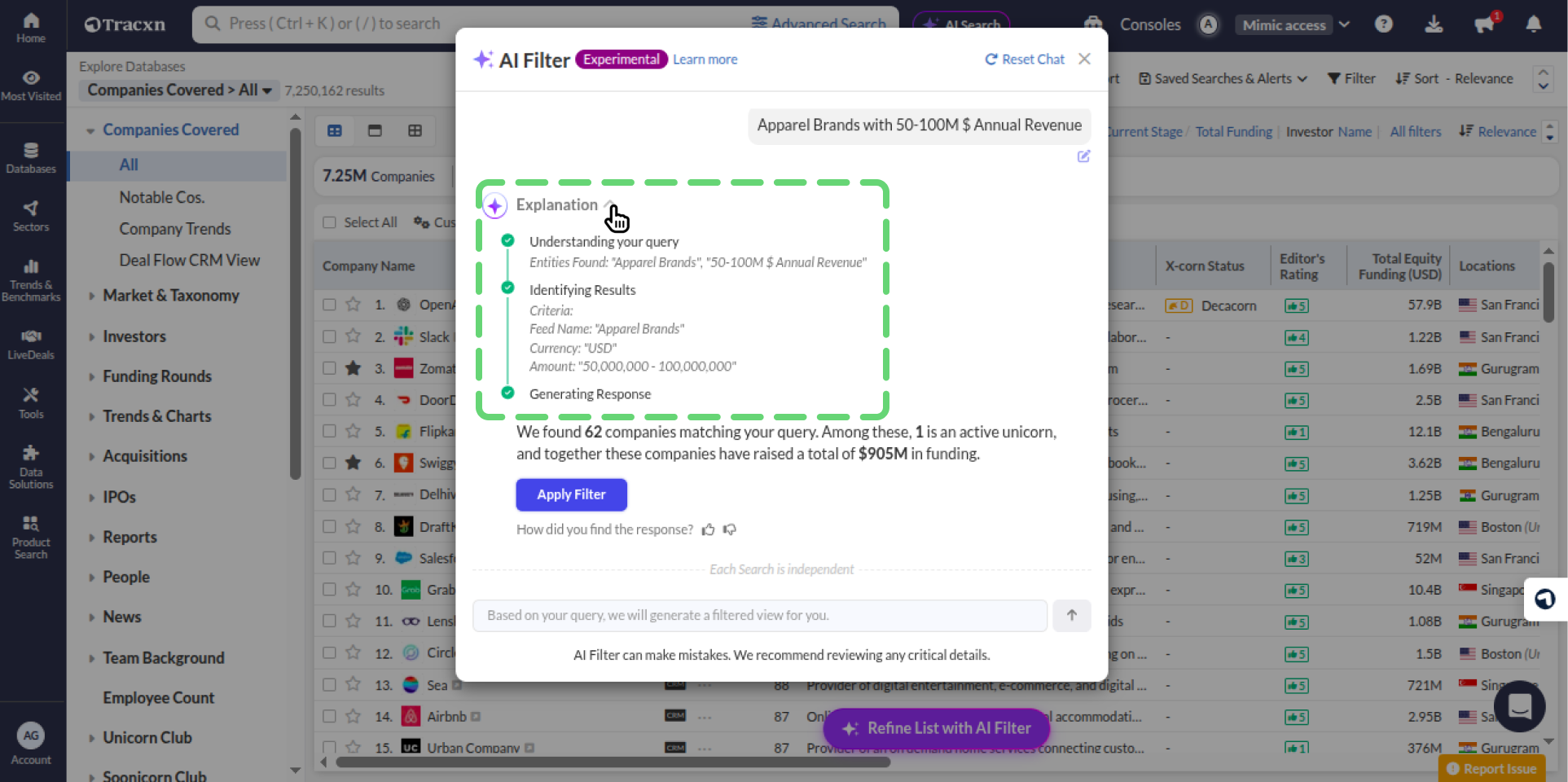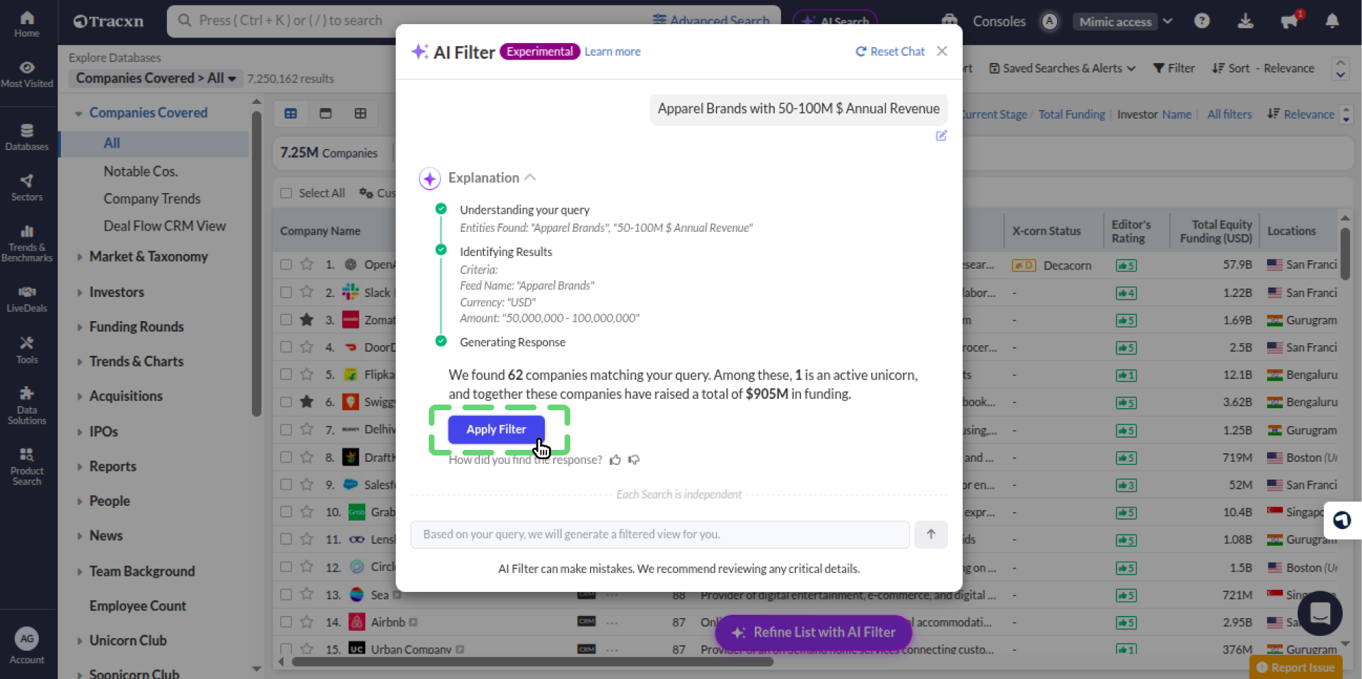 Just enter your query in the text box, click on Apply Filters to see the platform updated with companies that match your criteria.
