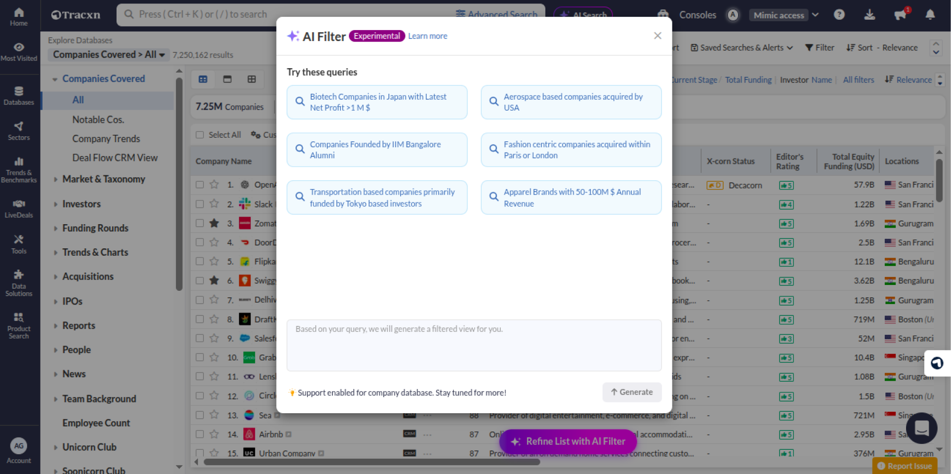 The AI Filter tool helps you discover the right companies by automatically identifying filters based on your query.