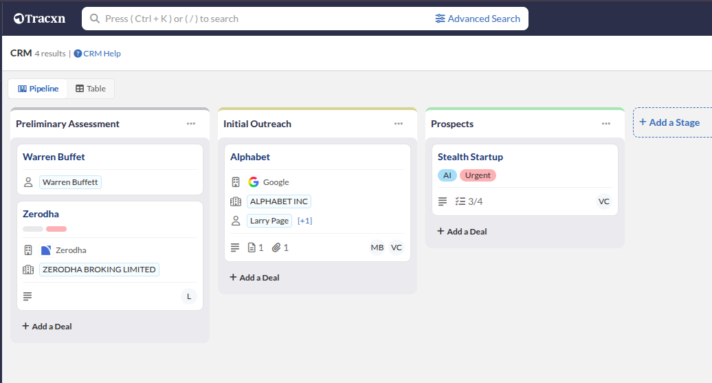 Tracxn's Deal Flow CRM is an intuitive, flexible and easy-to-use CRM built to simplify your everyday workflow. It is designed to help teams track, organize, and collaborate on opportunities of all kinds.