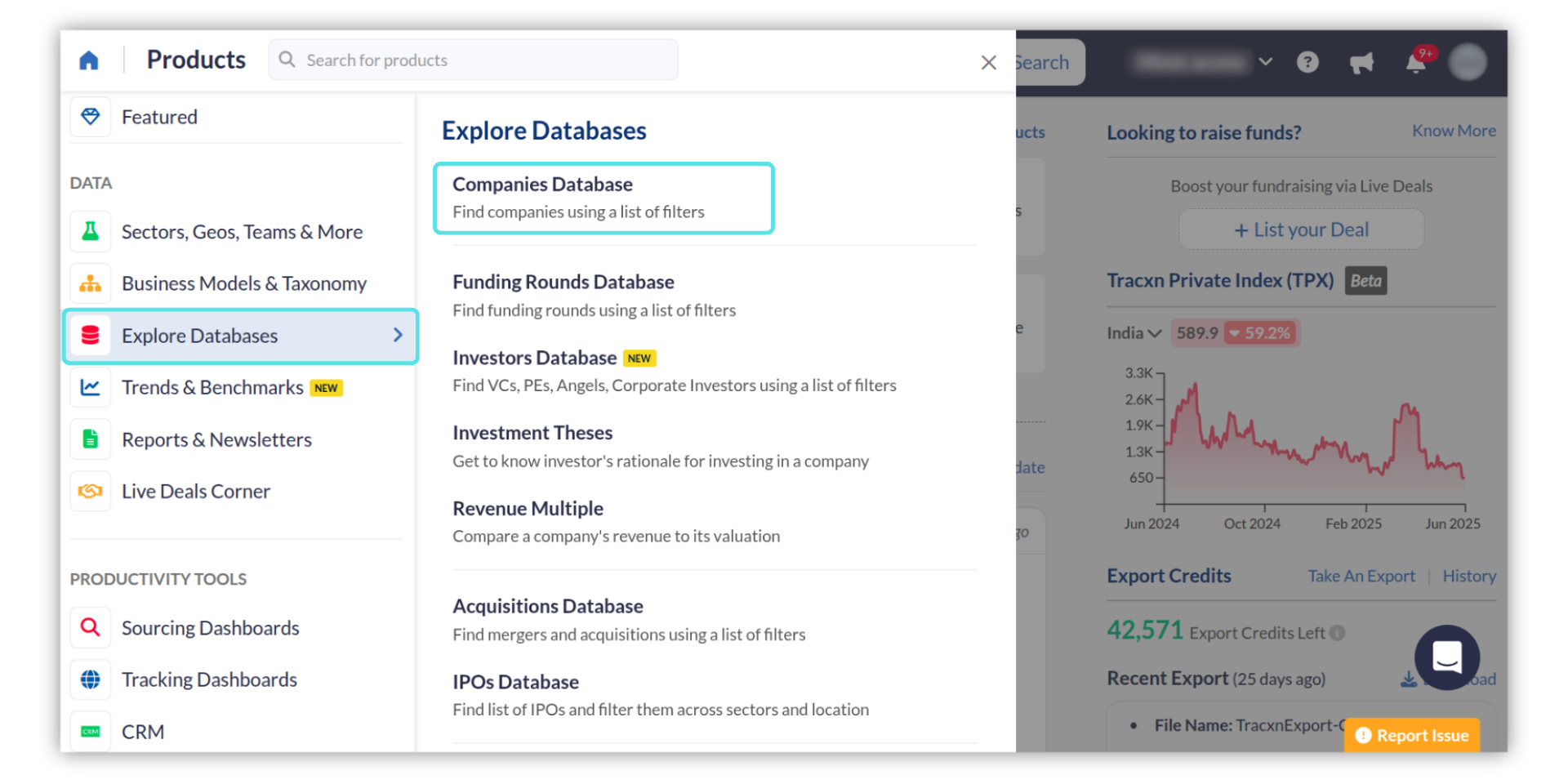 Access the Companies page from the Home Page, under Products Overview >Data> Explore Databases>Companies.