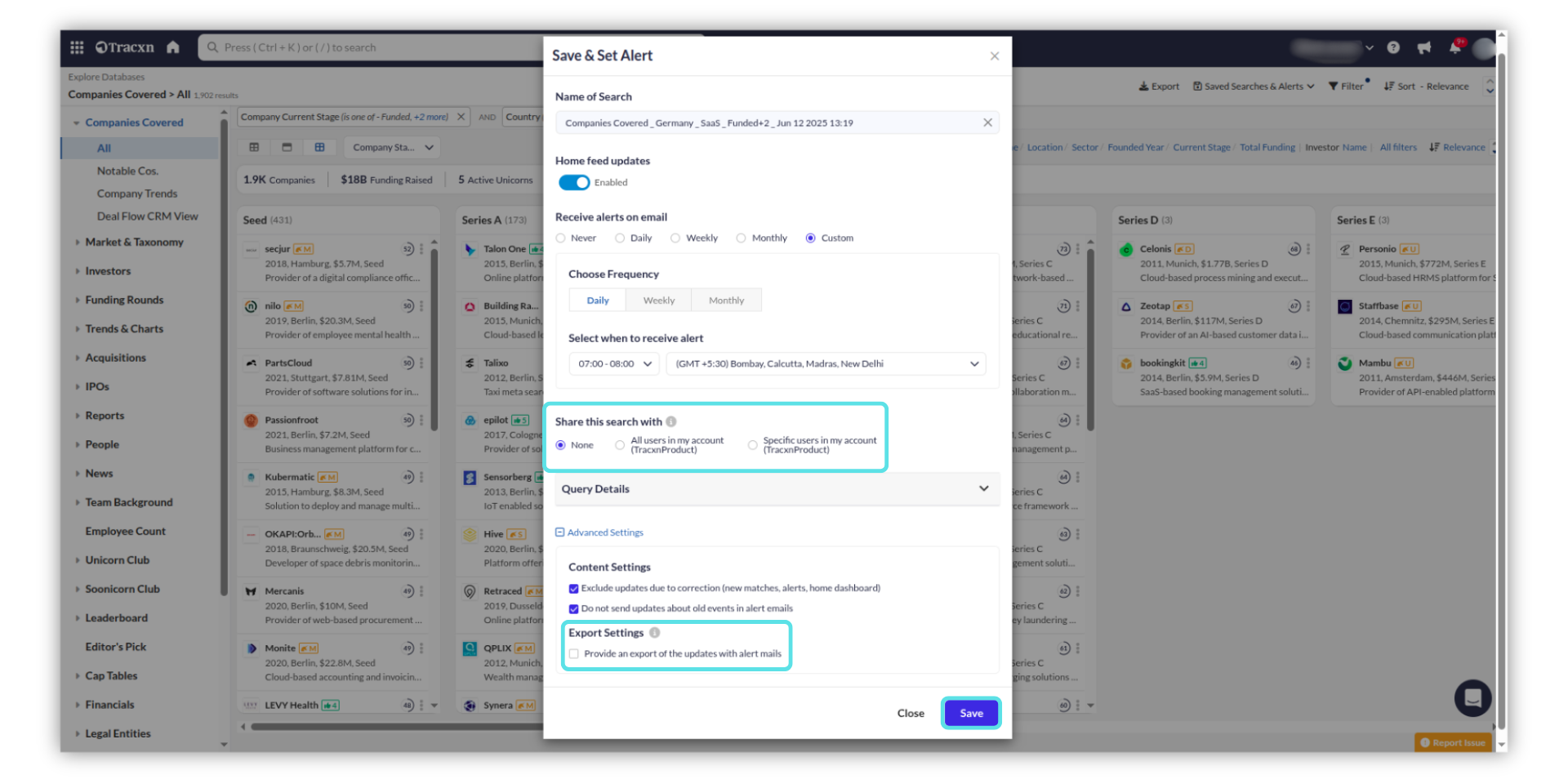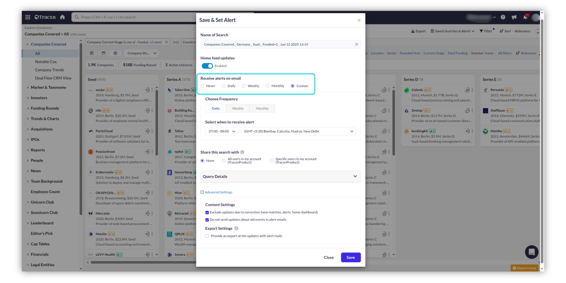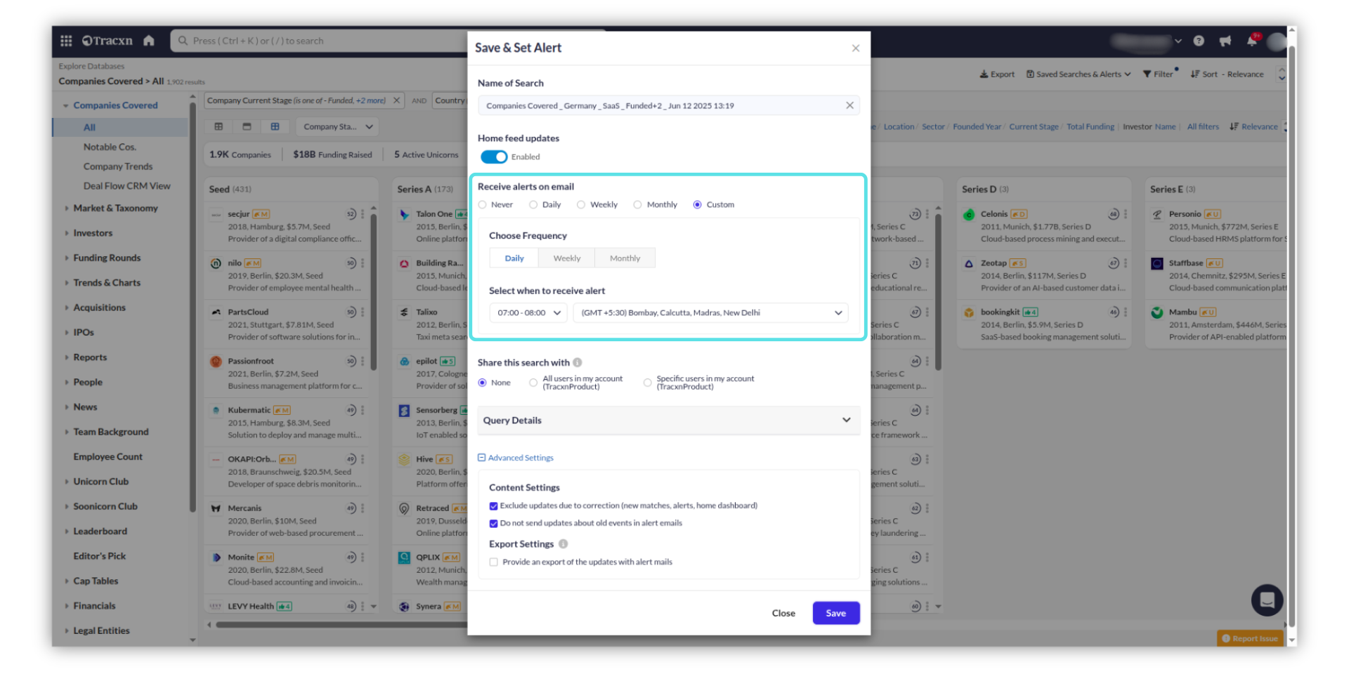 In the "Save & Set Alert" window, update the name to save the company's search. Select the desired frequency of receiving the alert.