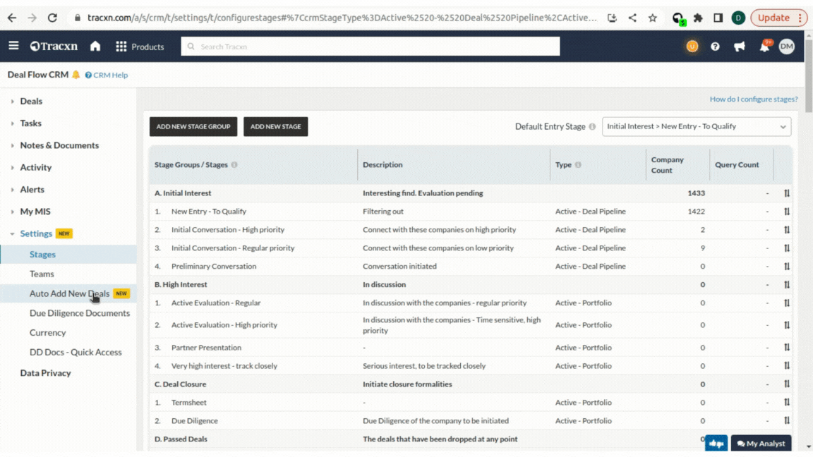 Auto-add new deal allows you to define a mandate using a query (Tracxn companies URL).