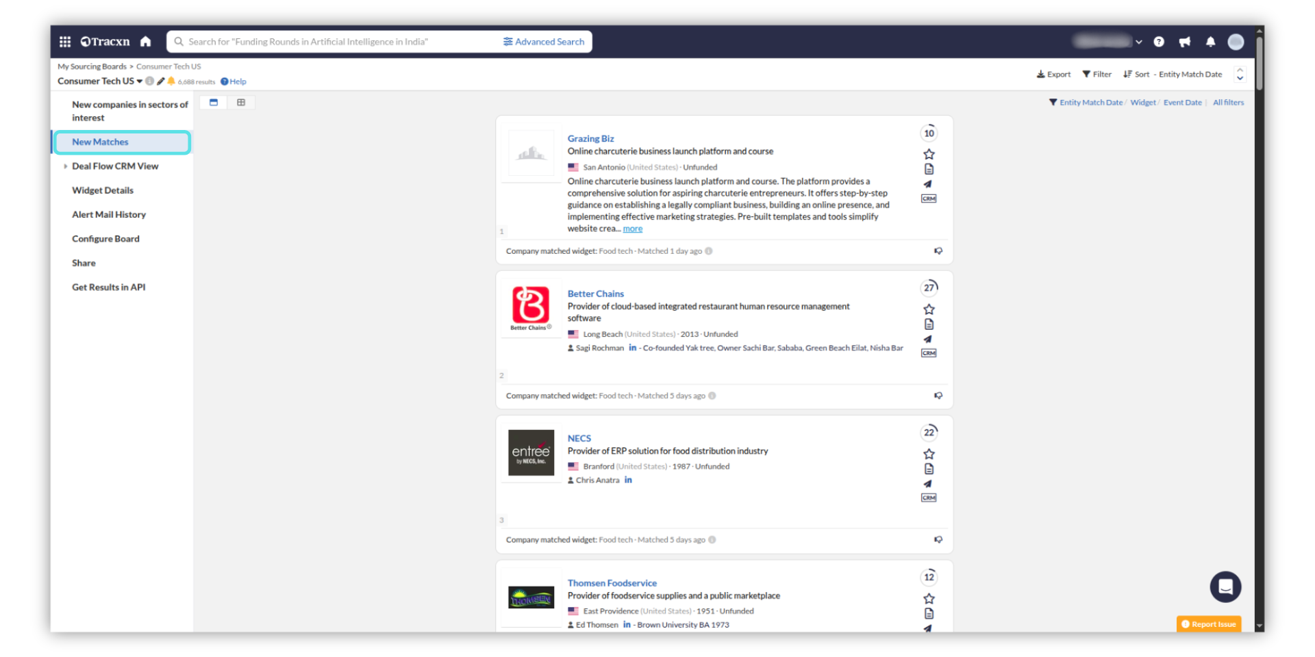 New Matches gives a list of new interesting companies that match the mandate set up in a sourcing dashboard.