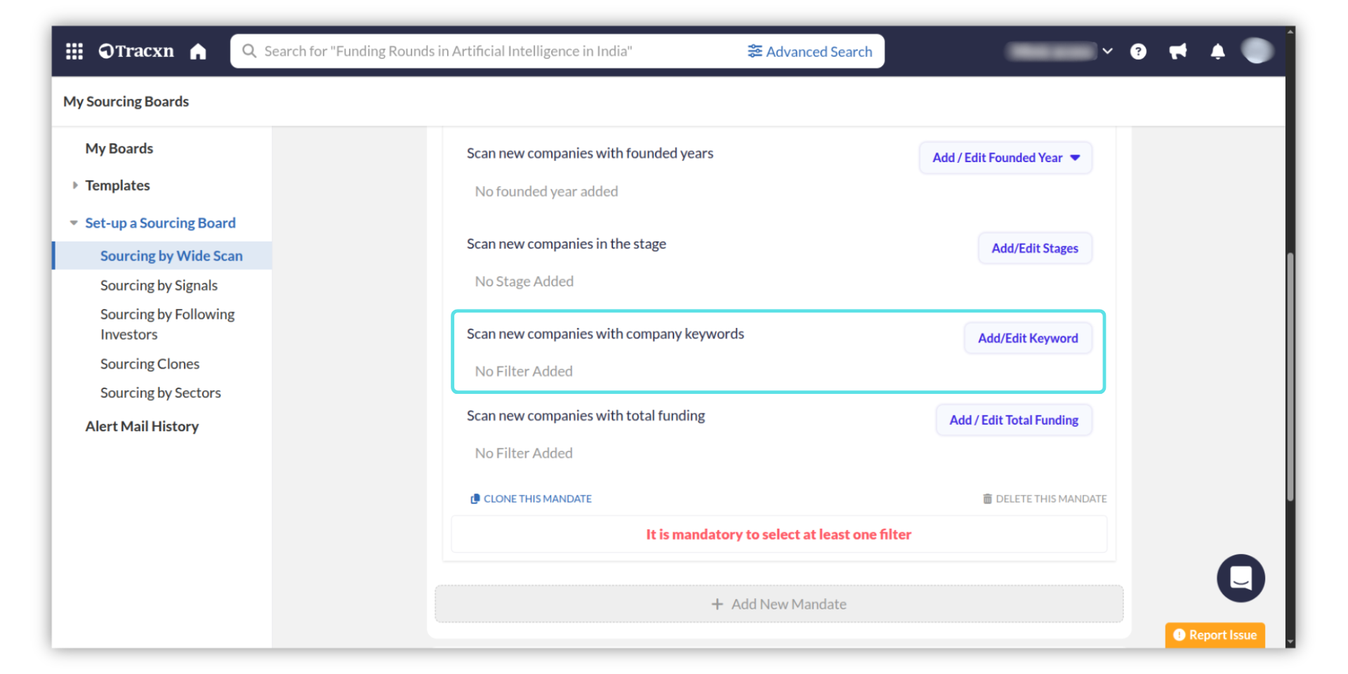 Go to the Mandate section, and fill in all the details that you want to set to your board. In the “Scan new companies with company keywords” section, click "Add/Edit Keyword" to open the Company Keyword page