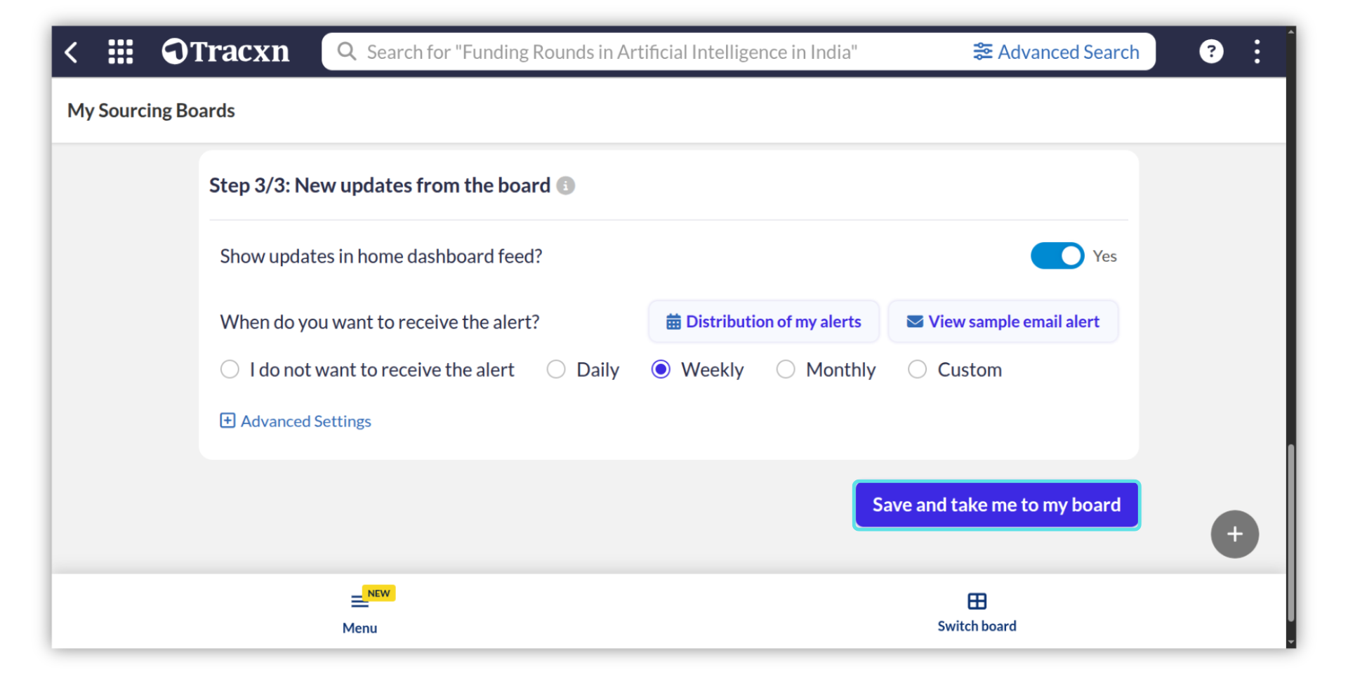 In Step 3, you have the option to choose whether you would like to see updates from this board in your home dashboard feed. Then, click "Save and take me to my board" to save the dashboard.