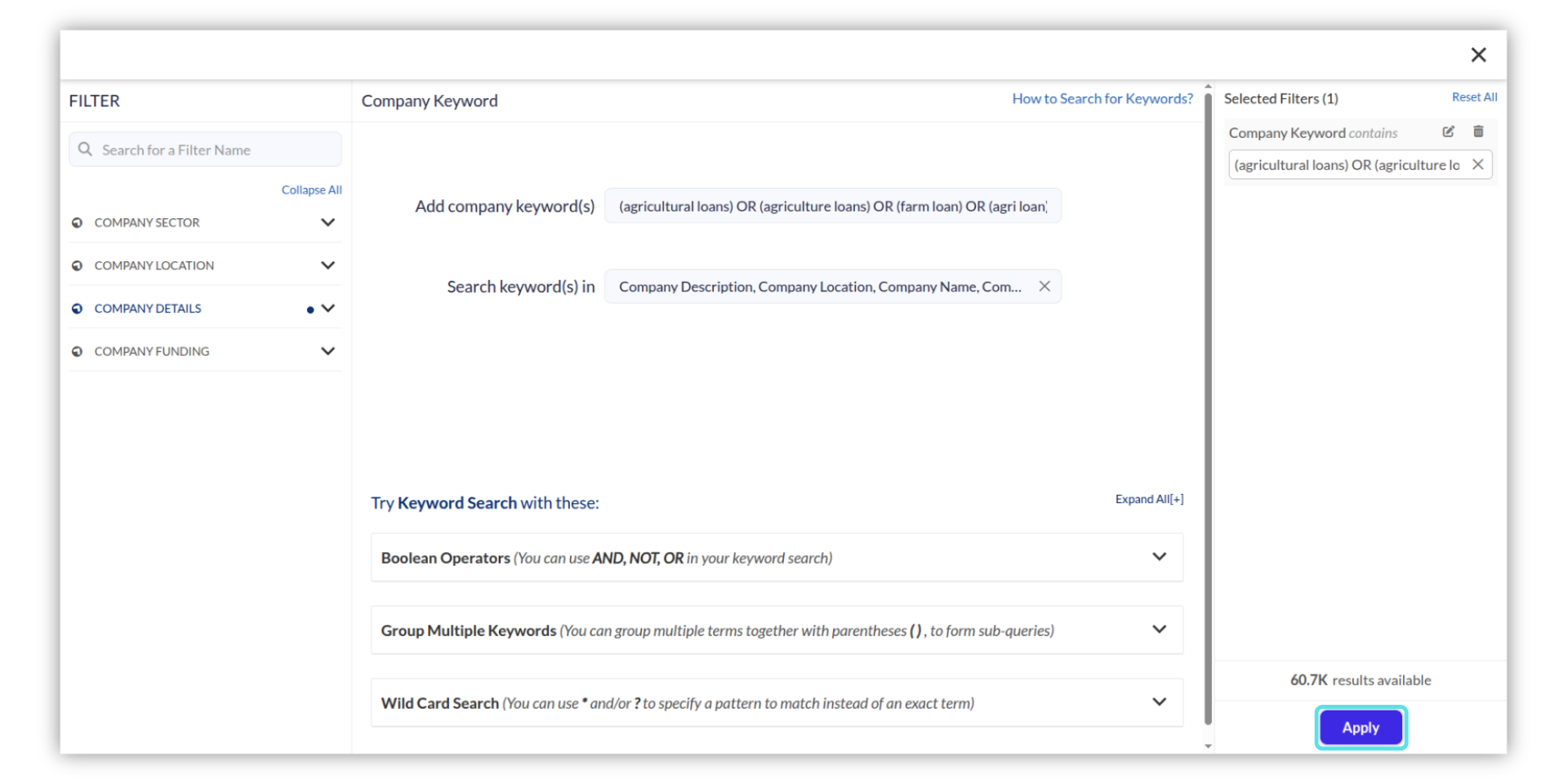 Let us consider the example of sourcing Agricultural Loan companies. You can follow these steps to add keywords in the mandate: