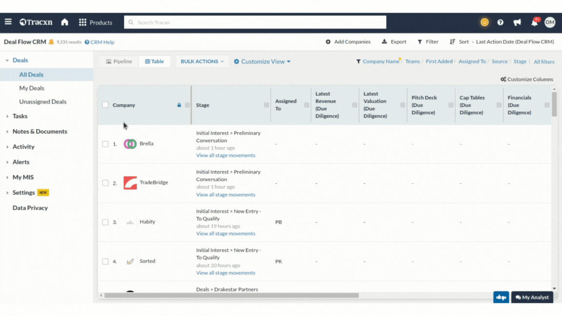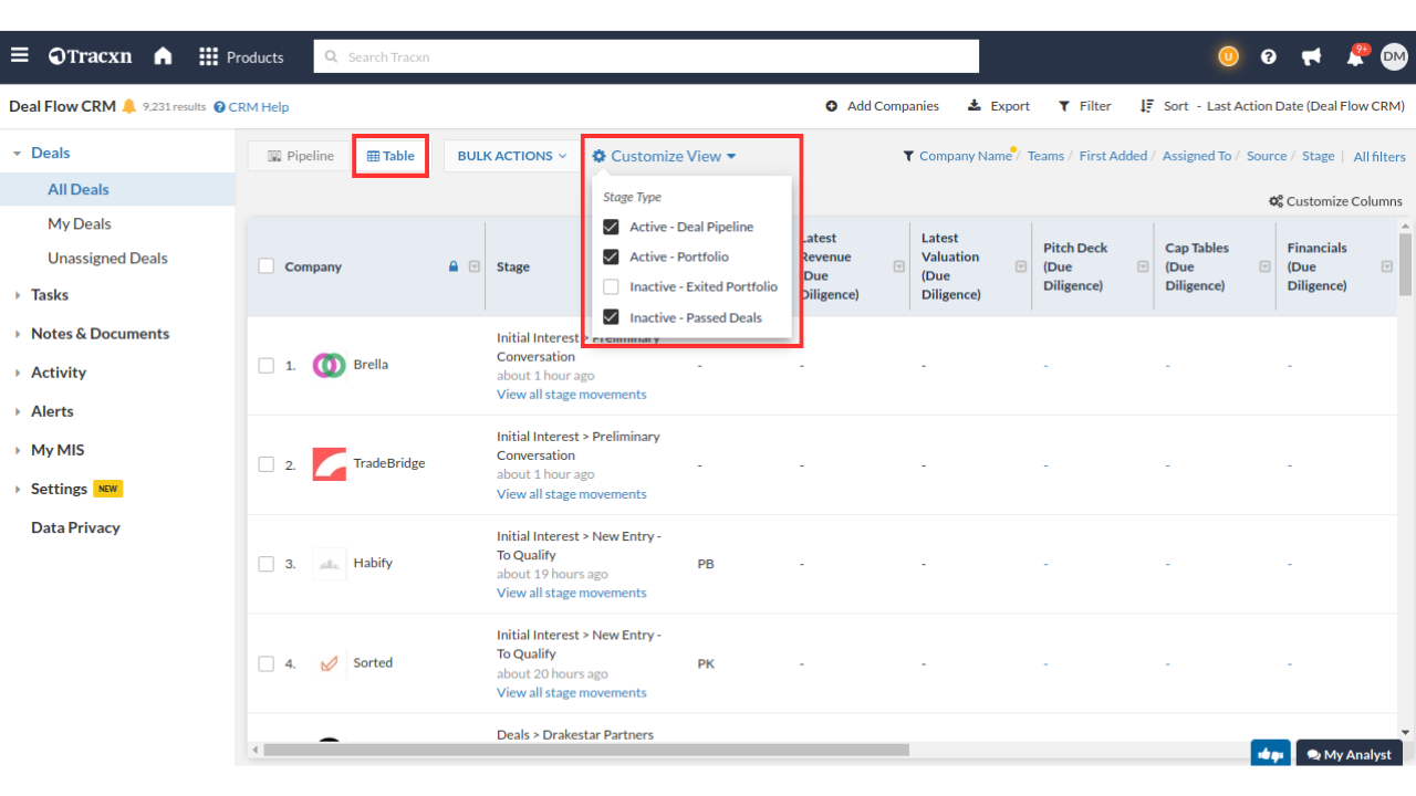The table view is a powerful administrative view within Deal Flow CRM that helps you easily consume large amounts of data. It also helps you run analytics using company filters in the CRM view.