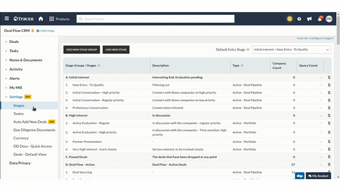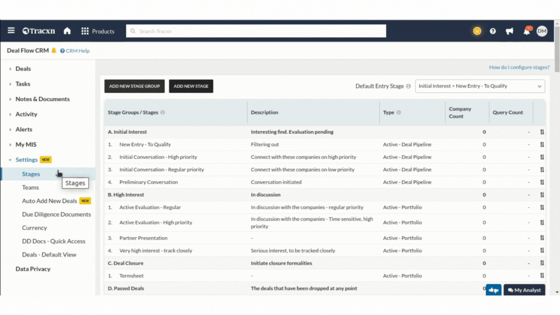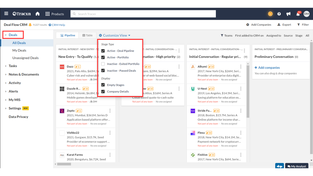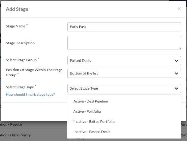 For example, the stage with deals that are under active evaluation can be marked 'Active - Deal Pipeline'. Similarly, you may want to mark stage with your passed deals as 'Inactive - Passed Deals'