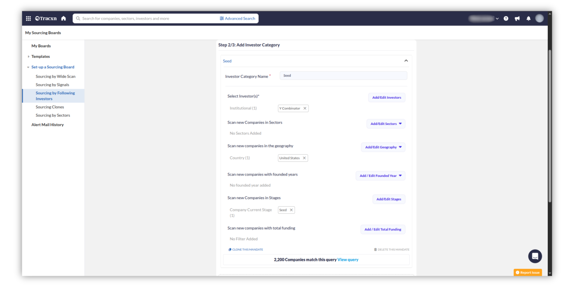 In the Investor Category section, give a name to the investor category and select one or more investors to this category. You can further refine your sourcing by using multiple filters such as Sectors, Geographies, Founded Years as shown below
