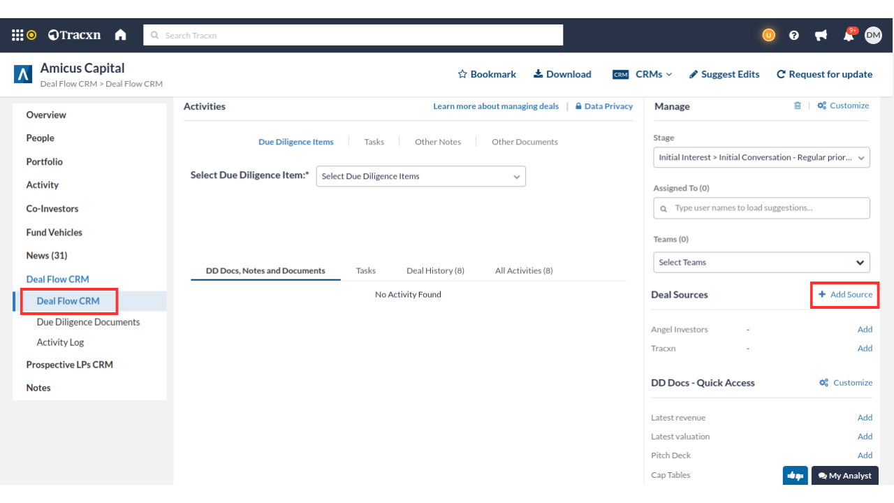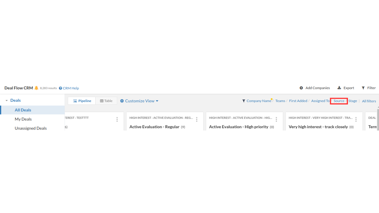 You can add the “Deal source” from the CRM Deal Flow page of the company profile page.