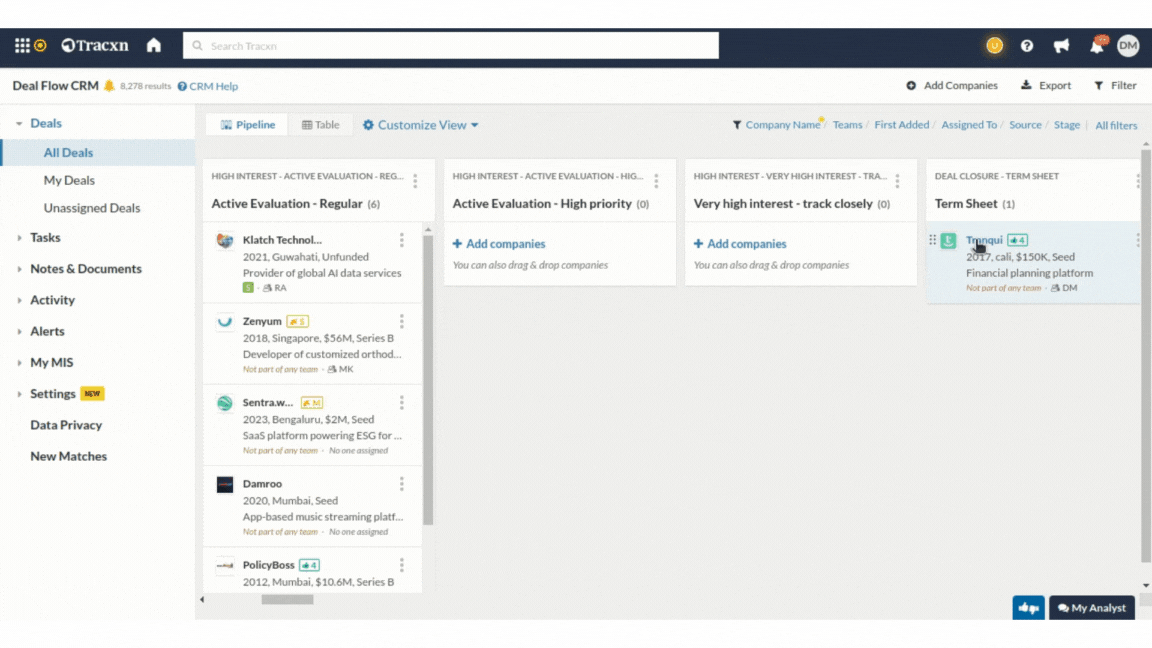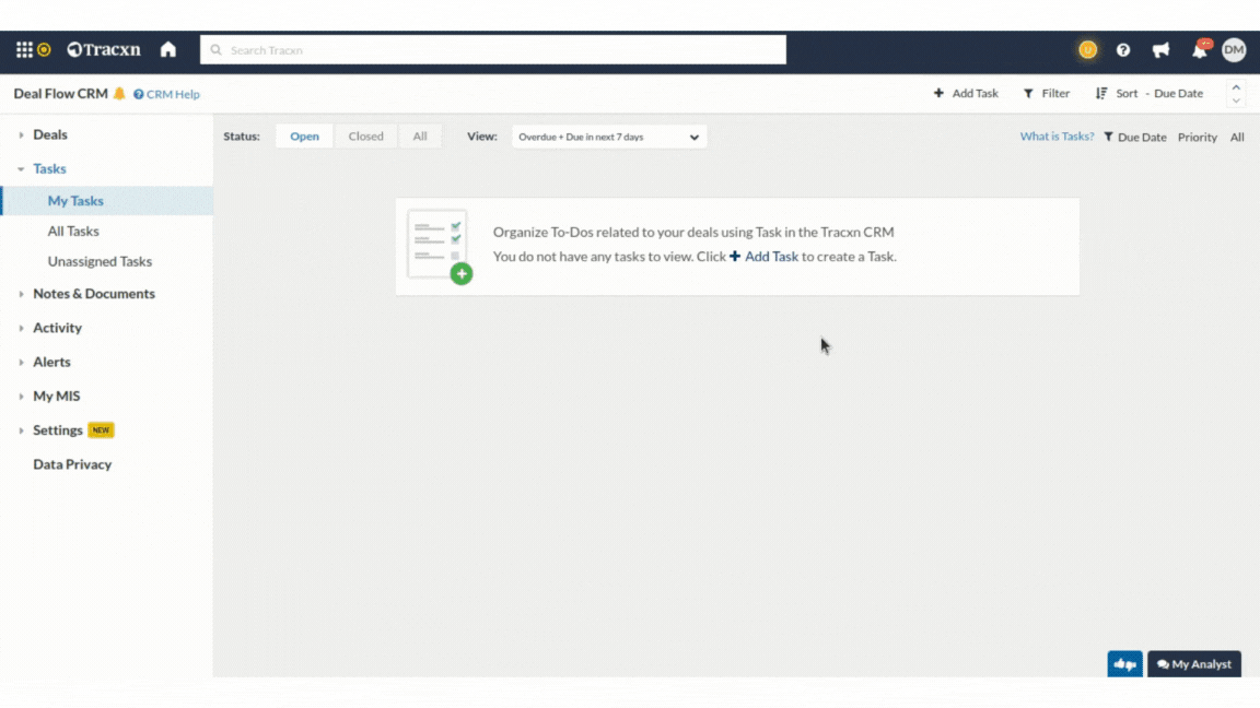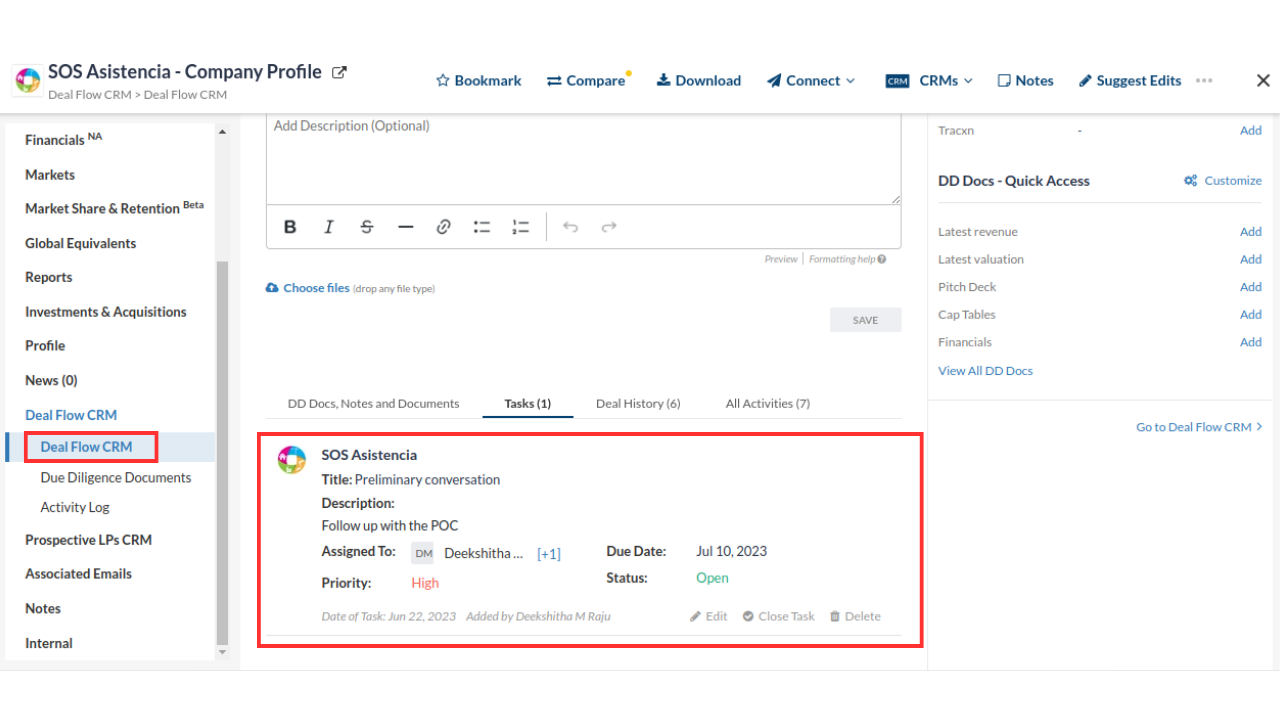 Click on the 'Tasks' button from the ‘Deal Flow CRM’ section of the company profile page.
