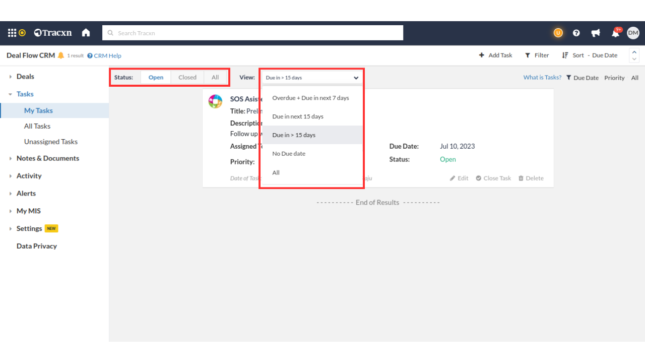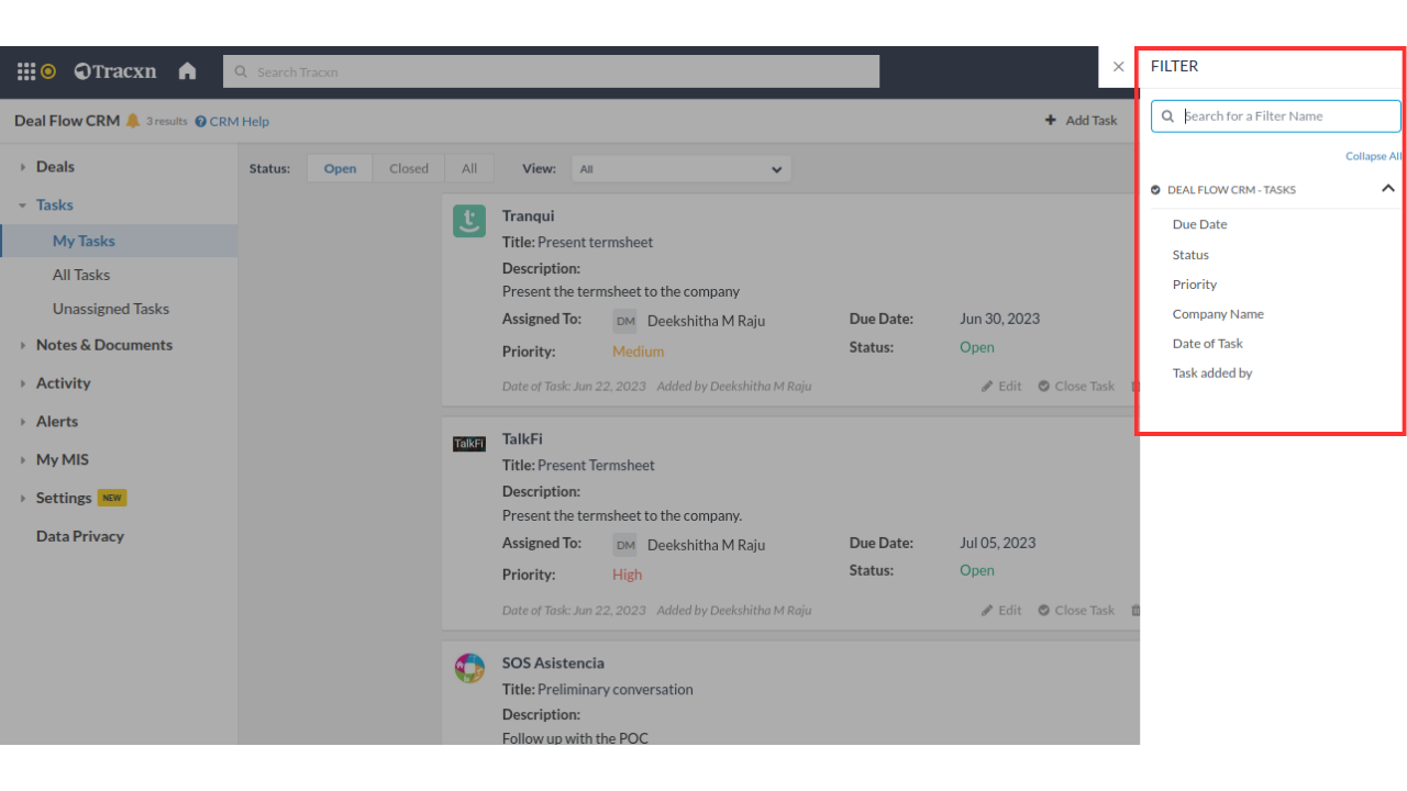 Utilise filters to selectively view tasks. You can narrow down your task view by applying filters based on various criteria such as the company name, task due date, task status, etc.