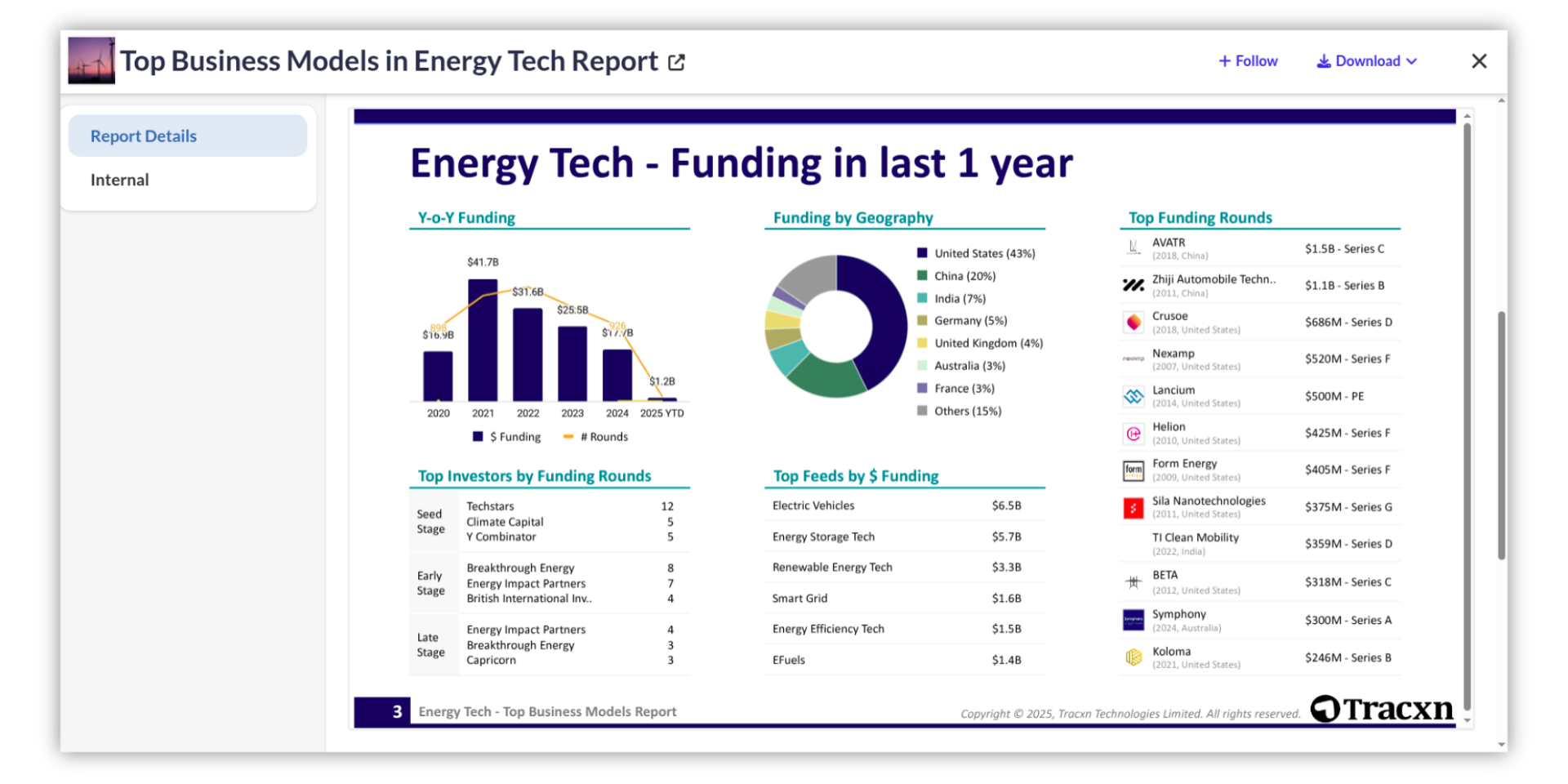 A snapshot of total funding in the sector or theme during the past year, segmented by business models, geographies, and funding stages (Seed, Early, Late).