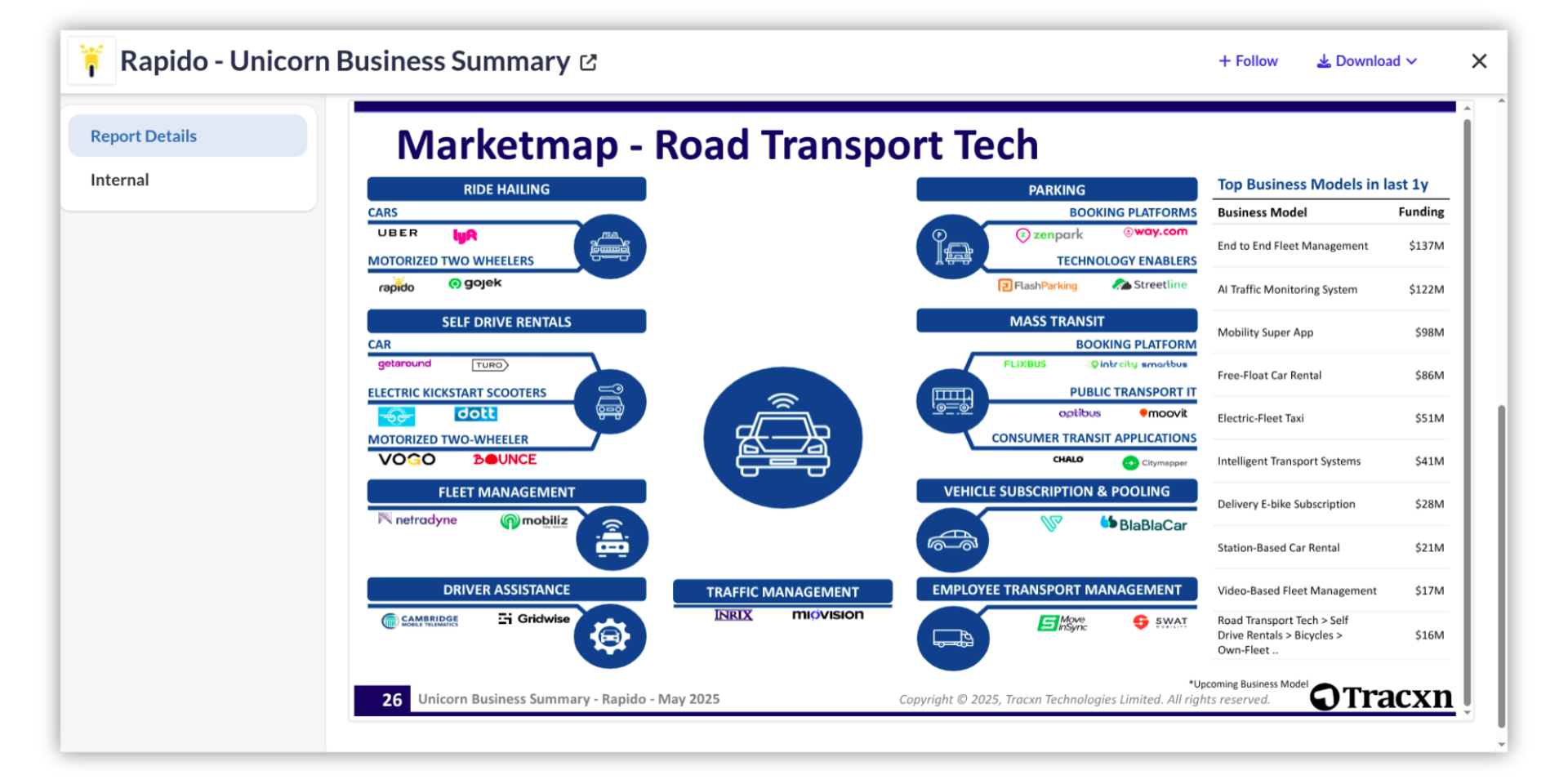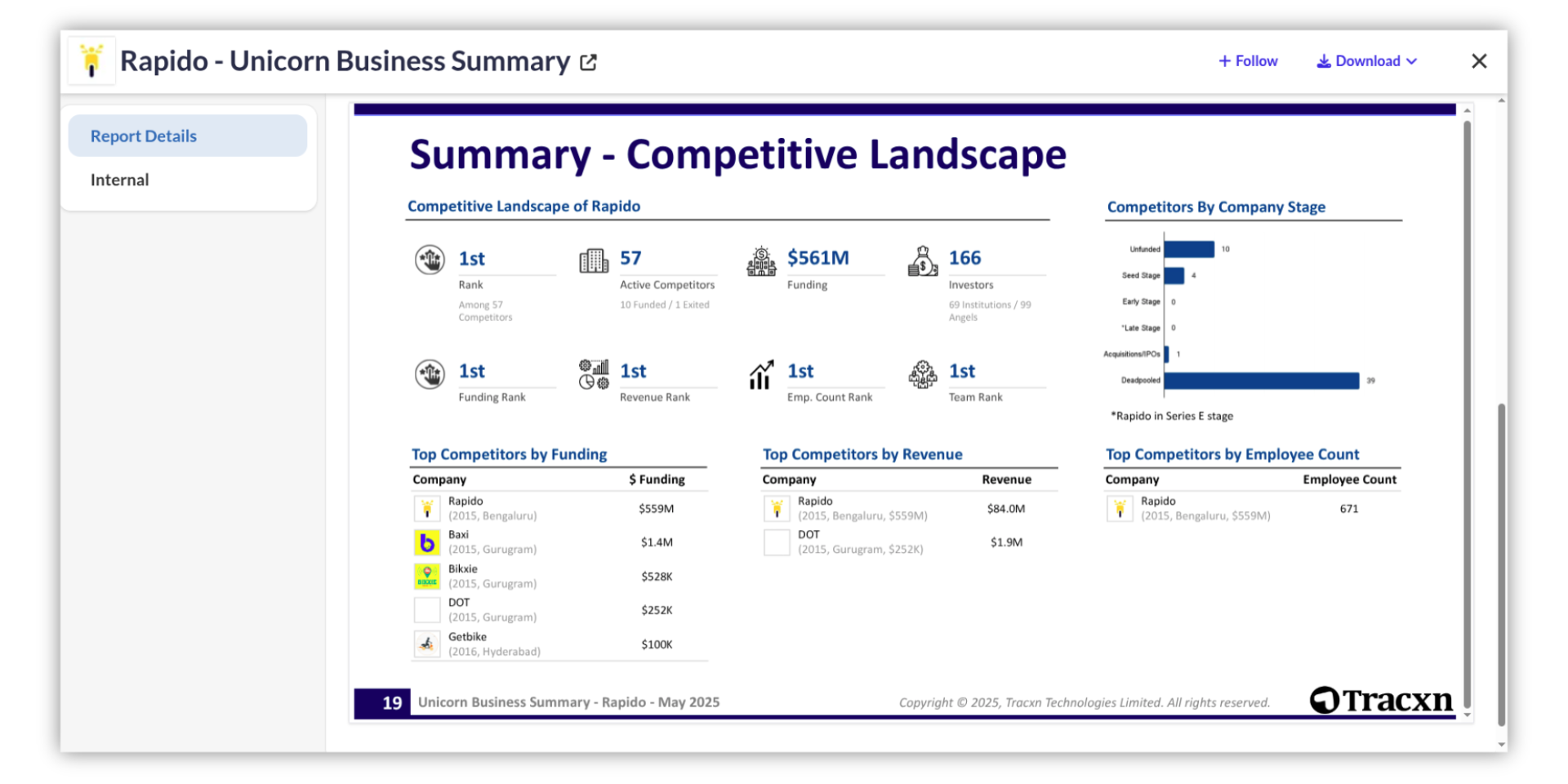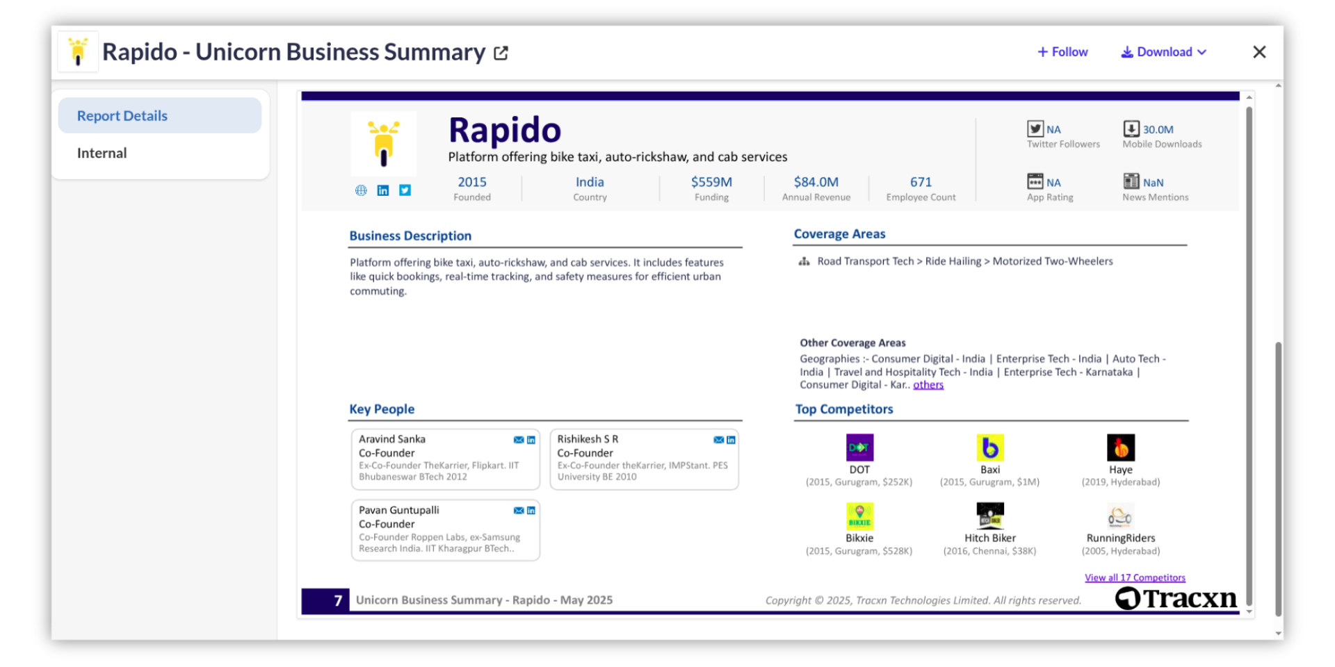 You will get a deep dive analysis of the company (Eg. Rapido - Unicorn Business Summary) and the market it operates in, including details on :