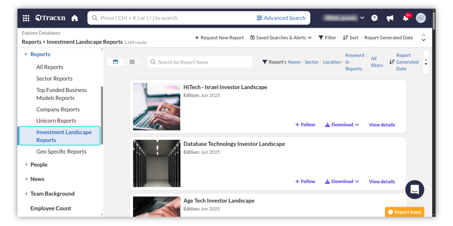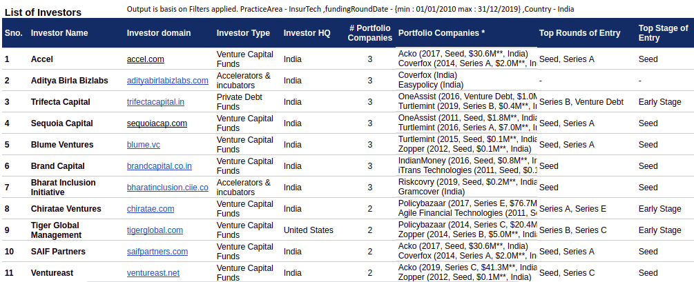 Tracxn’s Investment Landscape Reports help you analyse different categories of investors in your market based on their funding patterns - Stage of Entry, Focus sectors and Geographies.