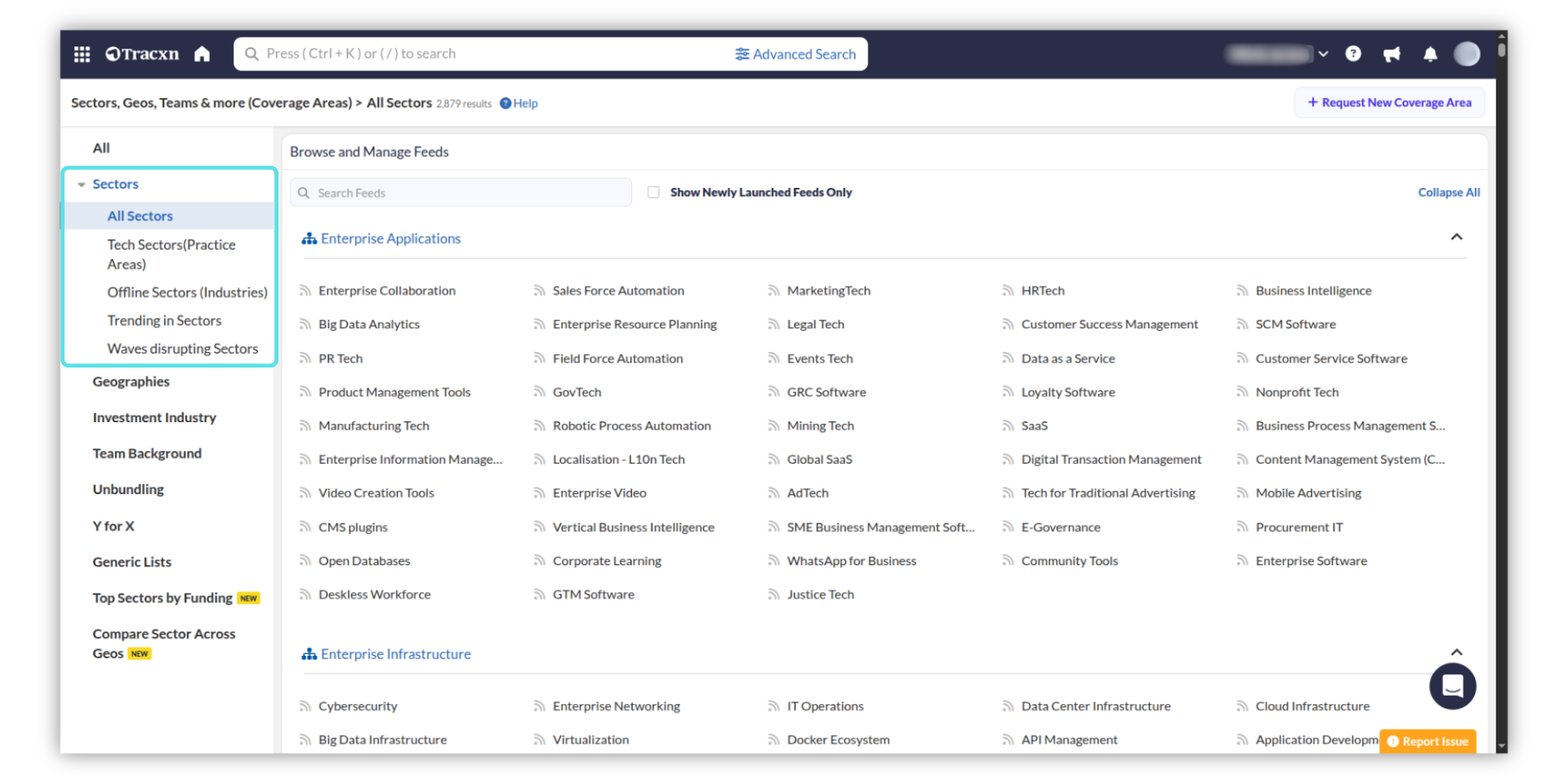 For instance, within the Tech Sector of Enterprise Applications, you can find feeds such as Enterprise Collaboration, Sales Force Automation, MarketingTech, HRTech, Business Intelligence, Big Data Analytics, Enterprise Resource Planning, and more.