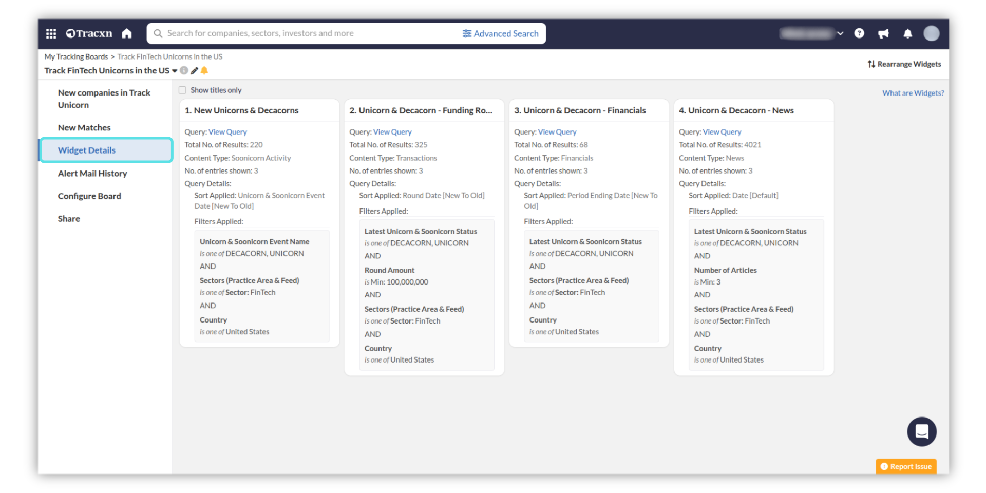 You can view the below Widgets in the Track Unicorns board. Each widget pertains to information on the latest Unicorns/Soonicorns in the interested sectors selected as per the mandate.