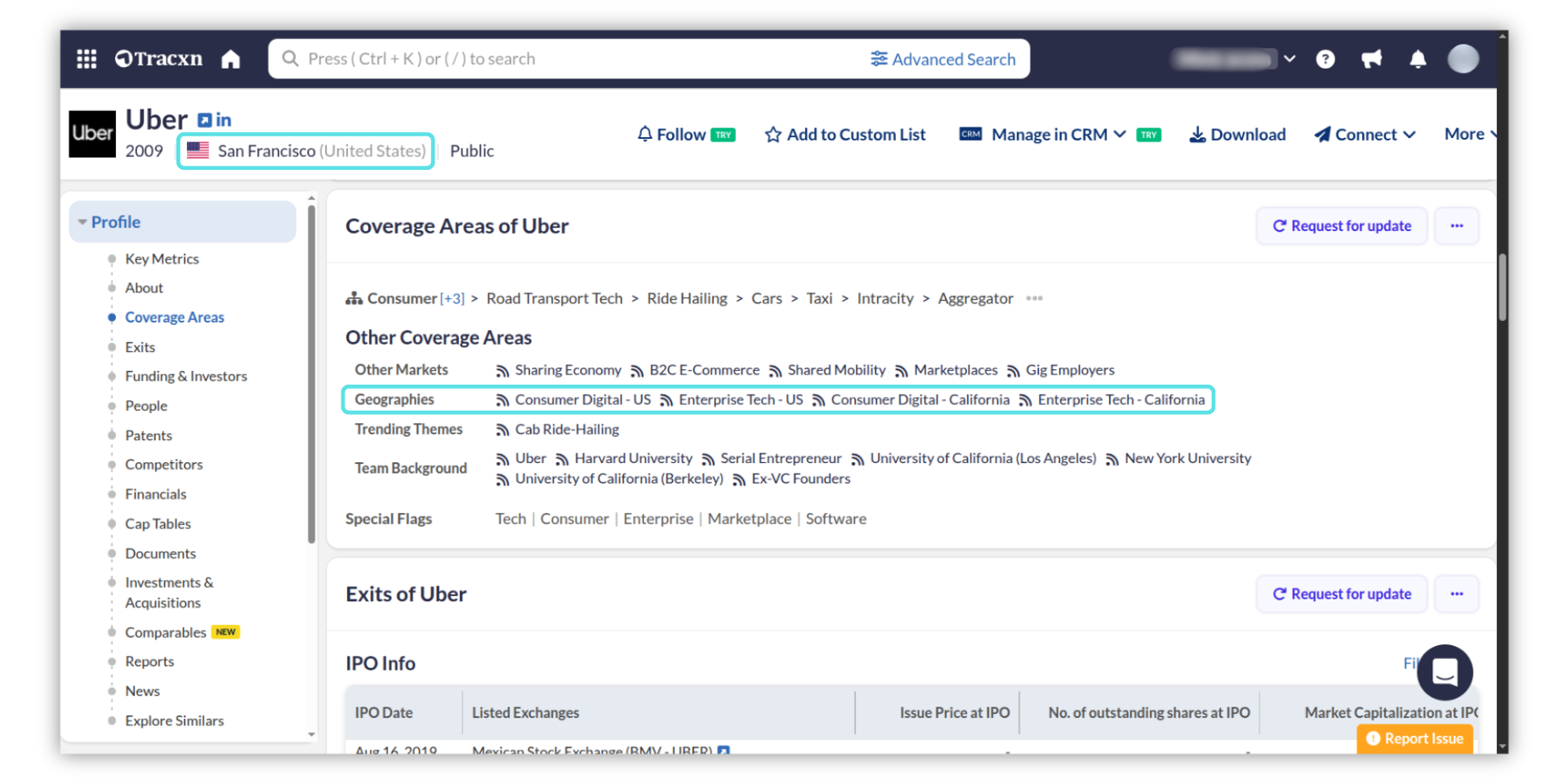 You can find the Geographies a company belongs to under the Other Coverage Areas section.
